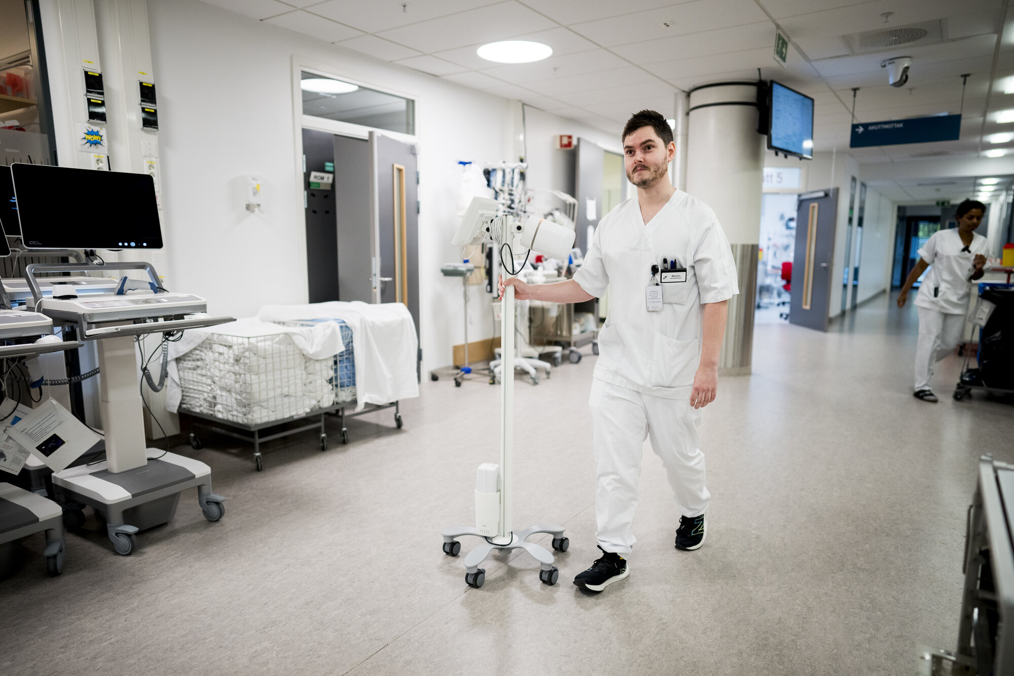 Sykepleier Martin Gjøvik kommer gjennom korridorene trillende på en slik Autoskår-monitor.