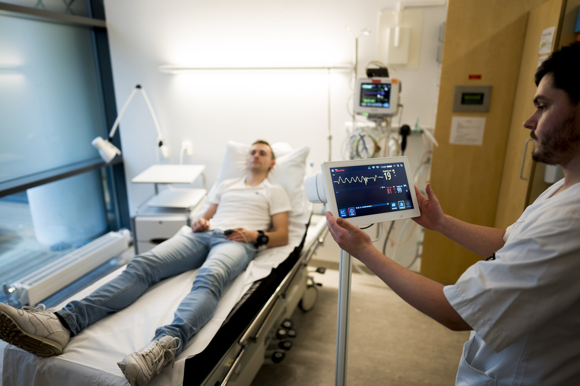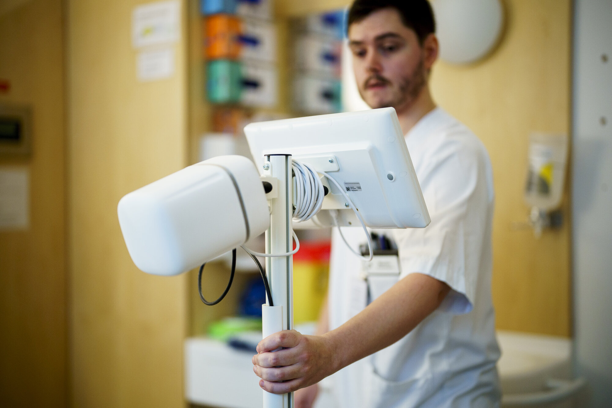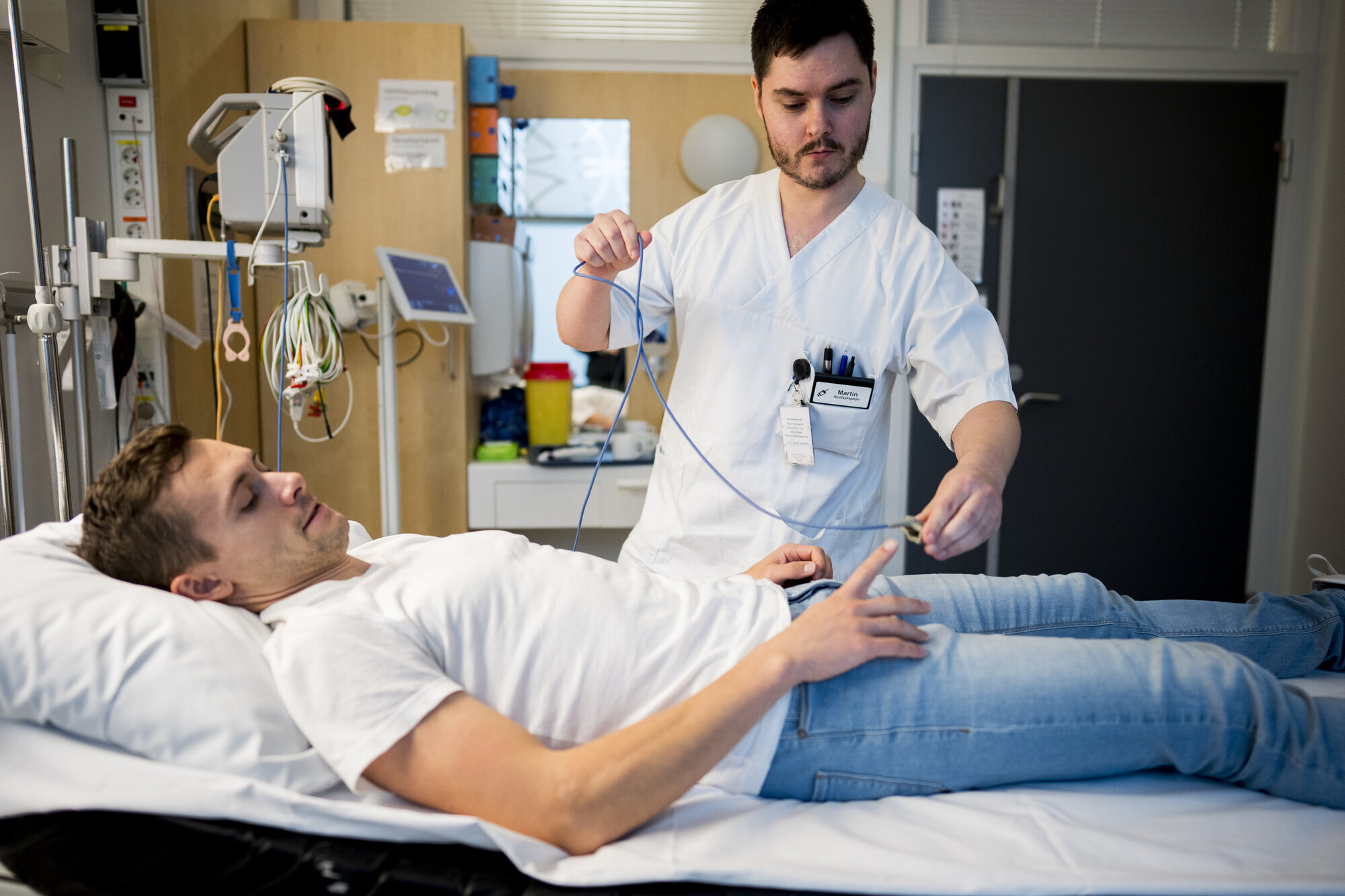 Martin Gjøvik og testpersonen gjør seg klar for NEWS-runde to: Han triller stativet til testsenga og sikter «snuten», det vil si radaren, mot brystområdet. Så klipser han på pulsoksymeter, det er festet til et armbånd.