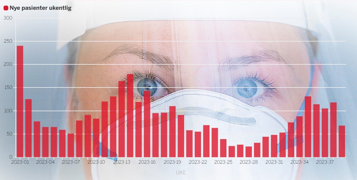 I overgangen fra juni til juli var antall innleggelser med covid-19 bare 48 i uka, men så steg det gradvis og var oppe på 220 i uke 36, i begynnelsen av september. Deretter har det altså gått litt ned til 204 innleggelser i forrige uke.