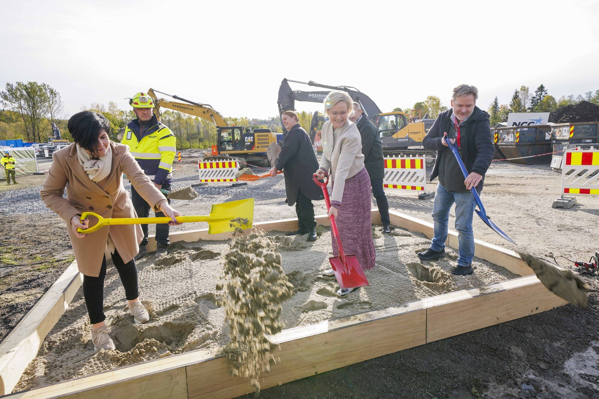 Bildet viser Helse- og omsorgsminister Ingrid Kjerkol markerte byggestart for Ny sikkerhetspsykiatri på Ila ved å ta det første spadetaket. Her sammen med leder for brukerutvalget i Oslo universitetssykehus HF Erna Hogrenning (f.v.), Kåre Magnus Bråthen fra NCC, klinikktillitsvalgt Ellinor Lønnå, klinikkdirektør Andreas Ringen og prosjektverneombudet Per Oddvar Synnes.