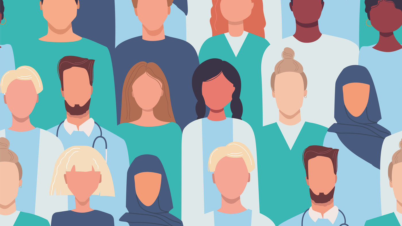 Illustrasjonen viser en gruppe med leger og andre helsearbeidere.