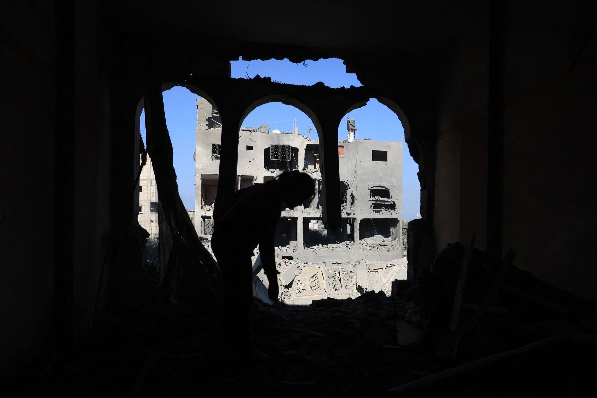 Bildet av et barn som inspiserer skadene etter angrep. Bildet er tatt 17. november 2023.