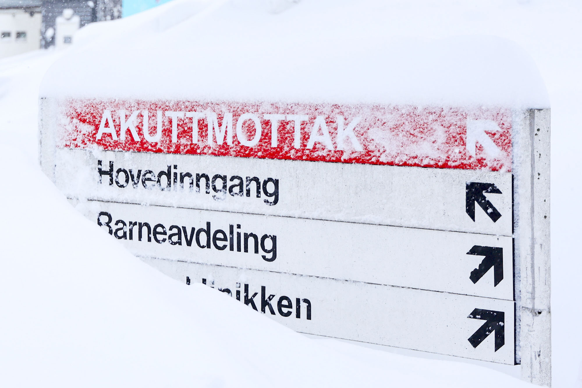 Bilde av nedsnødd inngangsparti på Sørlandet sykehus