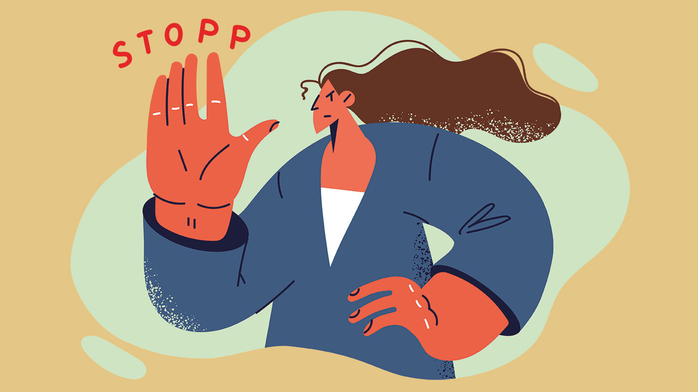 Illustrasjonen viser en sykepleier som holder hånden opp som stopp-tegn.