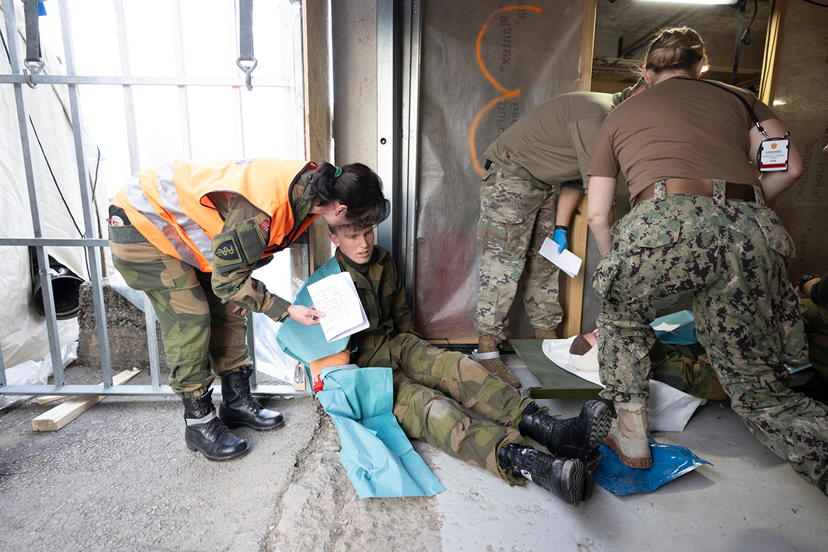 I garasjehaller like ved Oslo Lufthavn øves det på å redde liv i krig. Sanitetspersonell fra Norge, Nederland, England og USA stresstestes i å håndtere mange skadde på en gang.
