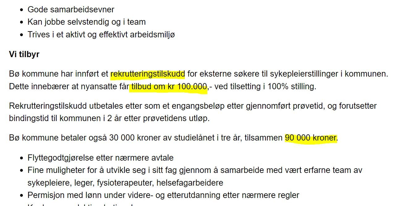 Bø kommune, som ligger rett utenfor Sortland, tilbyr også det samme: 100 000 kroner til sykepleiere i 100 prosent stilling, mot bindingstid på 2 år (bildet under).