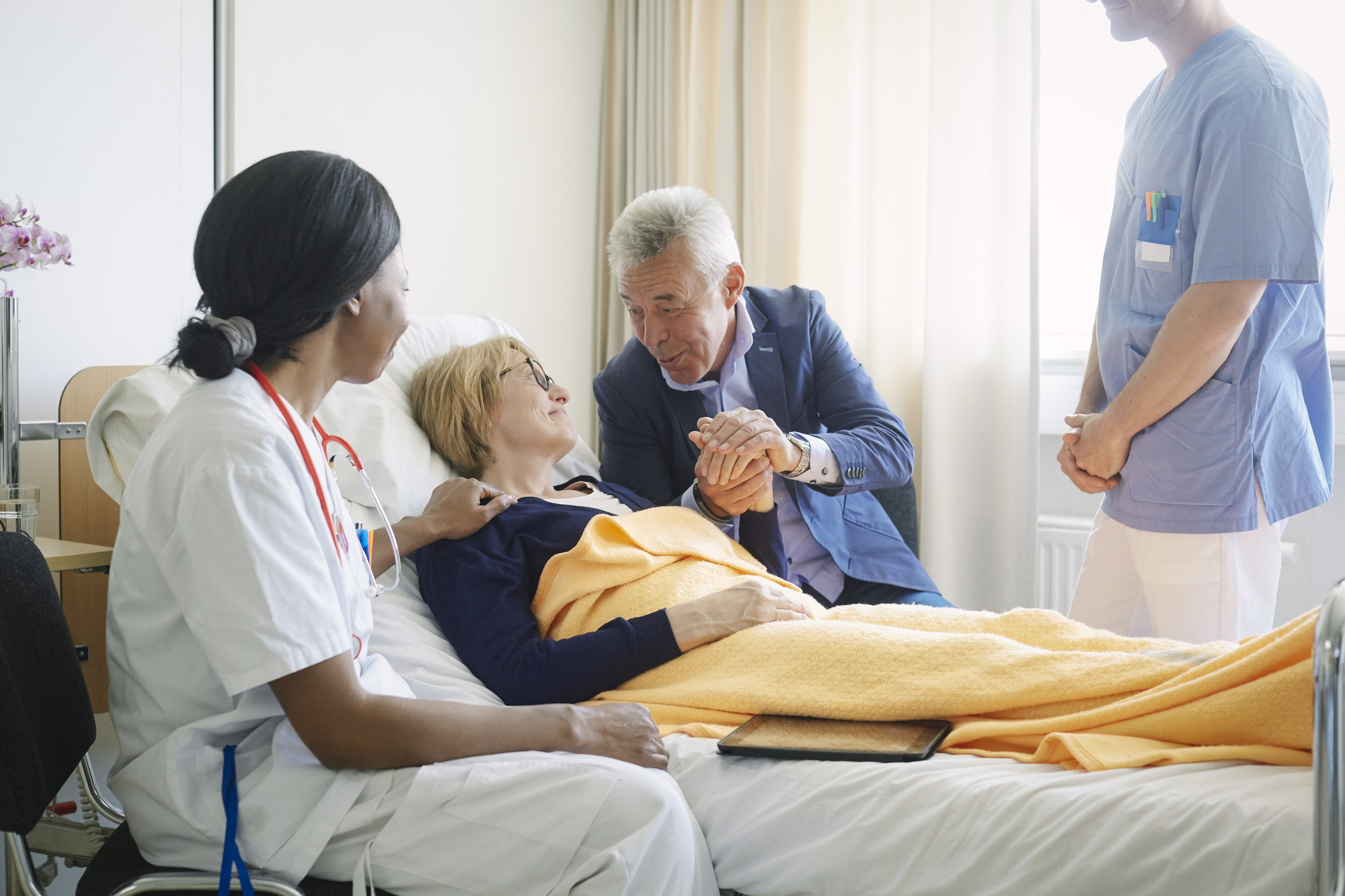 Bildet viser en pasient sammen med pårørende og helsepersonell.