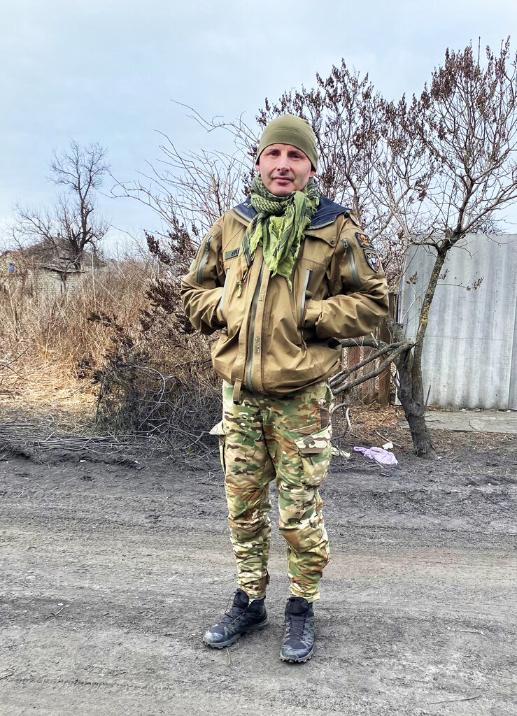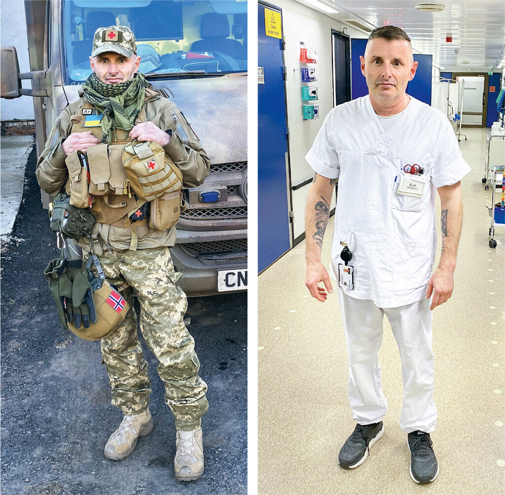Kurt Mørk Eriksen er frivillig sykepleier i Ukraina. Men han er kledd som en ukrainsk soldat.