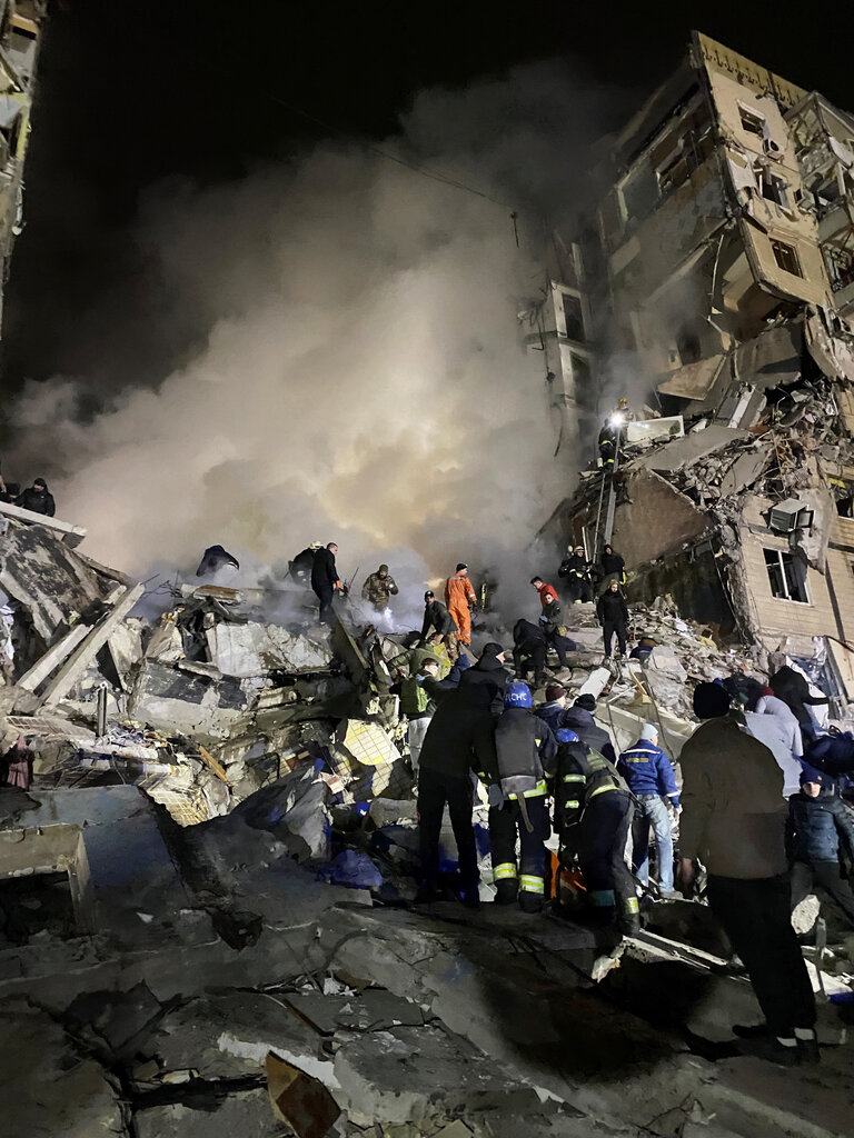 I byen Dnipro kollapser en ni etasjers blokk etter å ha blitt truffet av en russisk rakett.