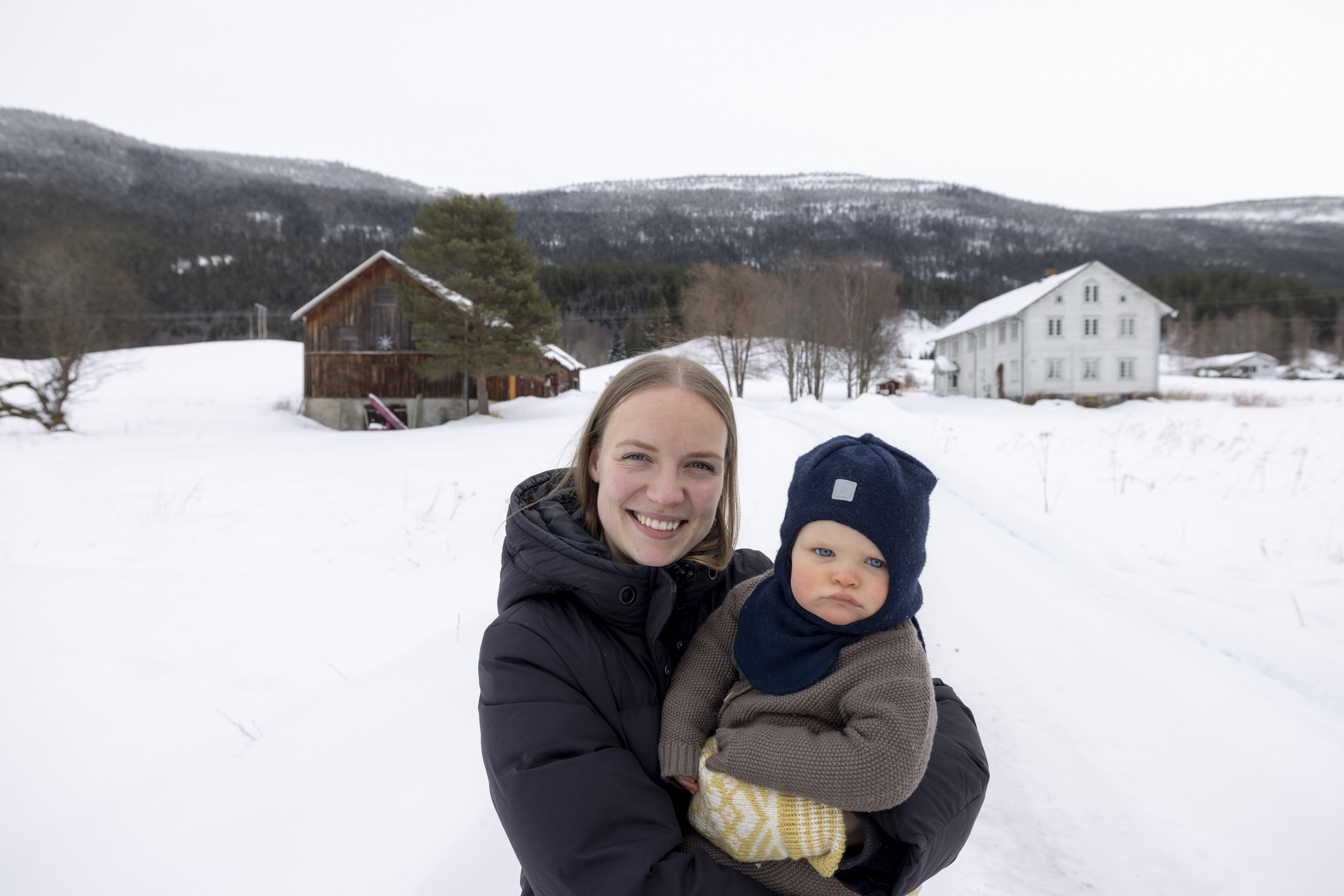 RENDALEN (Sykepleien): Lilla Vilja virker ikke helt fornøyd med å være ute i det småsure vinterværet, men hun er relativt tålmodig på mamma Odas arm under fotograferingen.