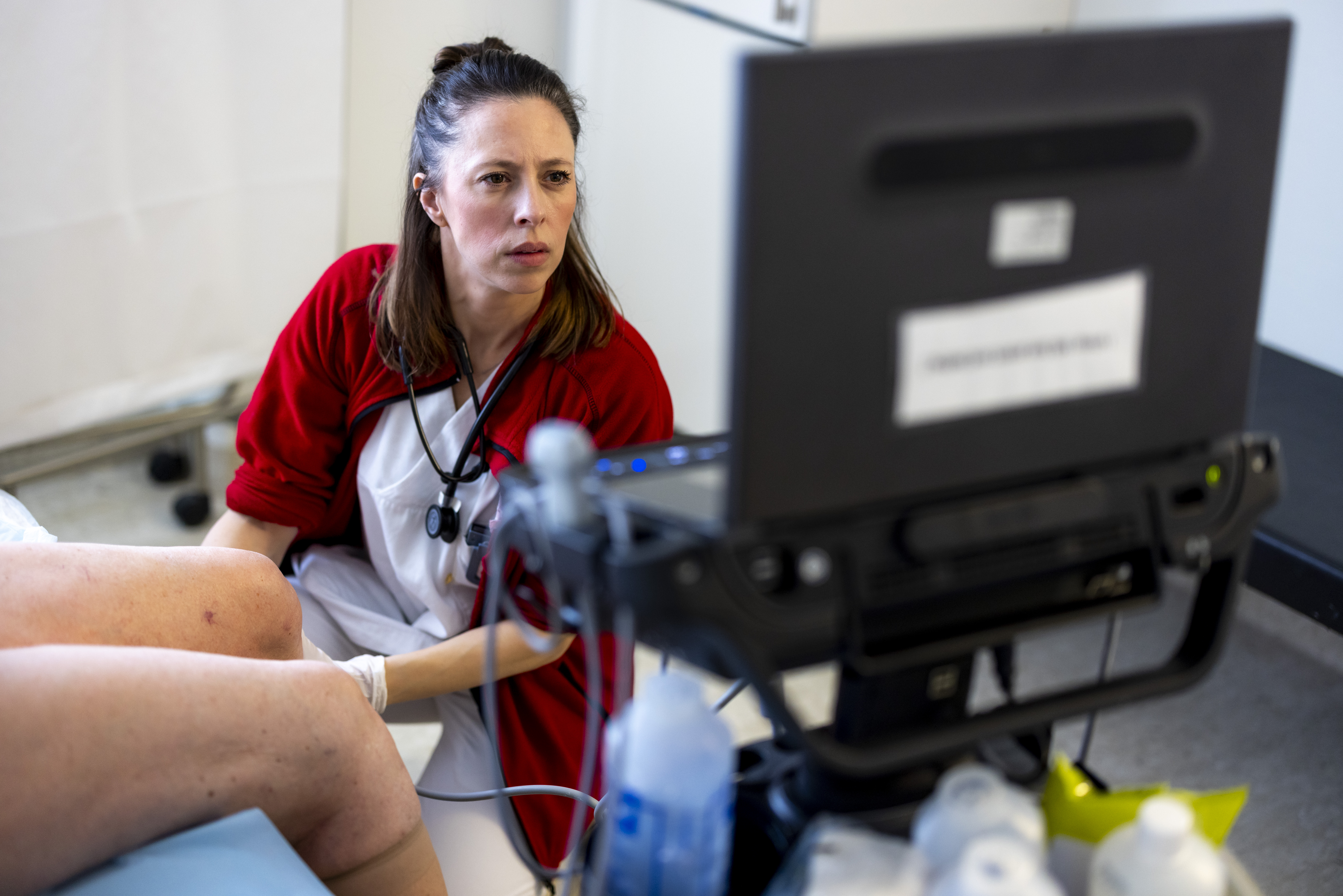 Randi Anette Ejme tar opp grundig sykehistorie, undersøker, måler hevelse og tar ultralyd. Hun jobber seg frem mot diagnose i tett samarbeid med akuttlegene på Sykehuset i Telemark.