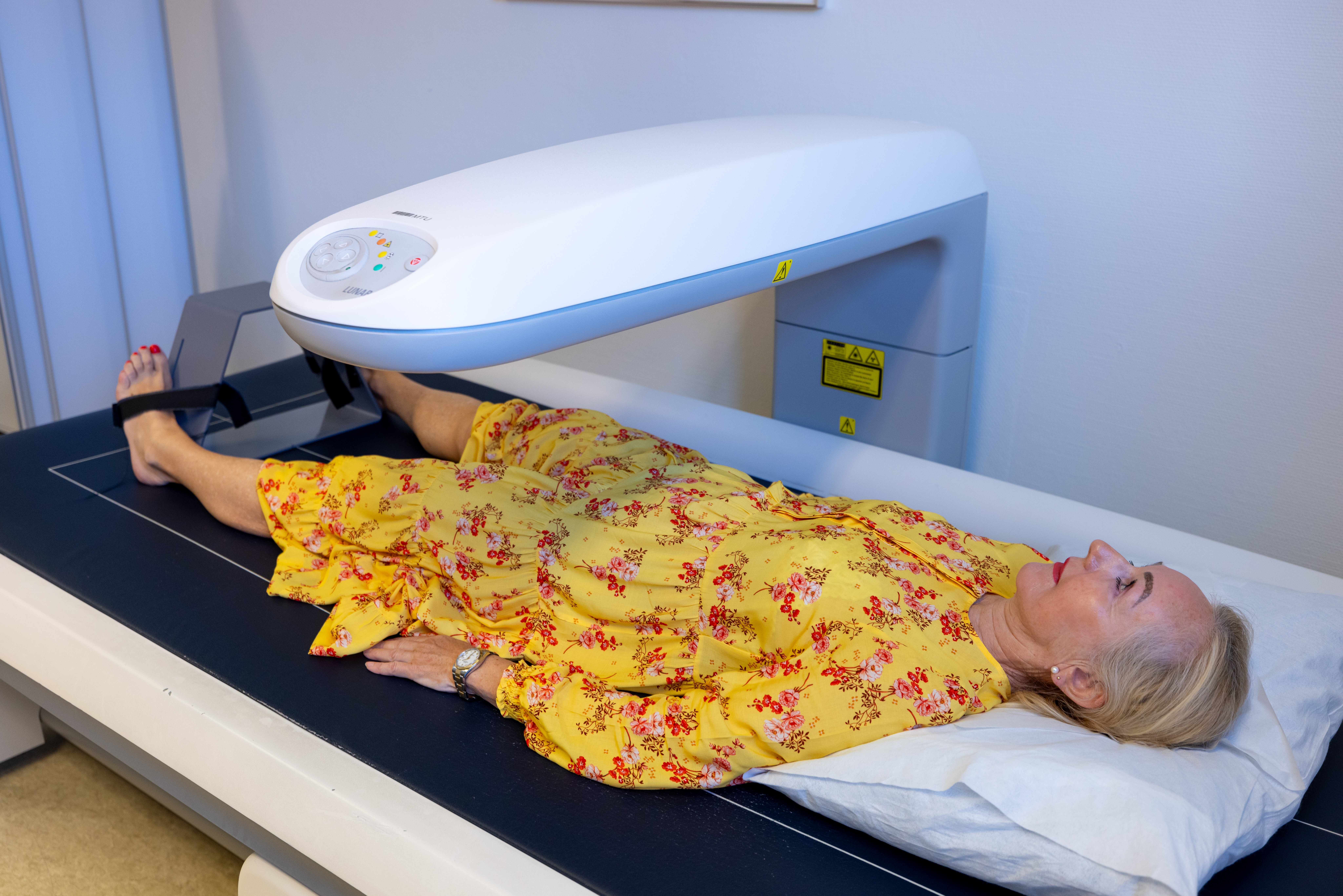 Så må Saraby legge seg i DXA-maskinen. Finjarn fester pasientens føtter og justerer hoften slik at hun ligger riktig for bildene som skal tas.