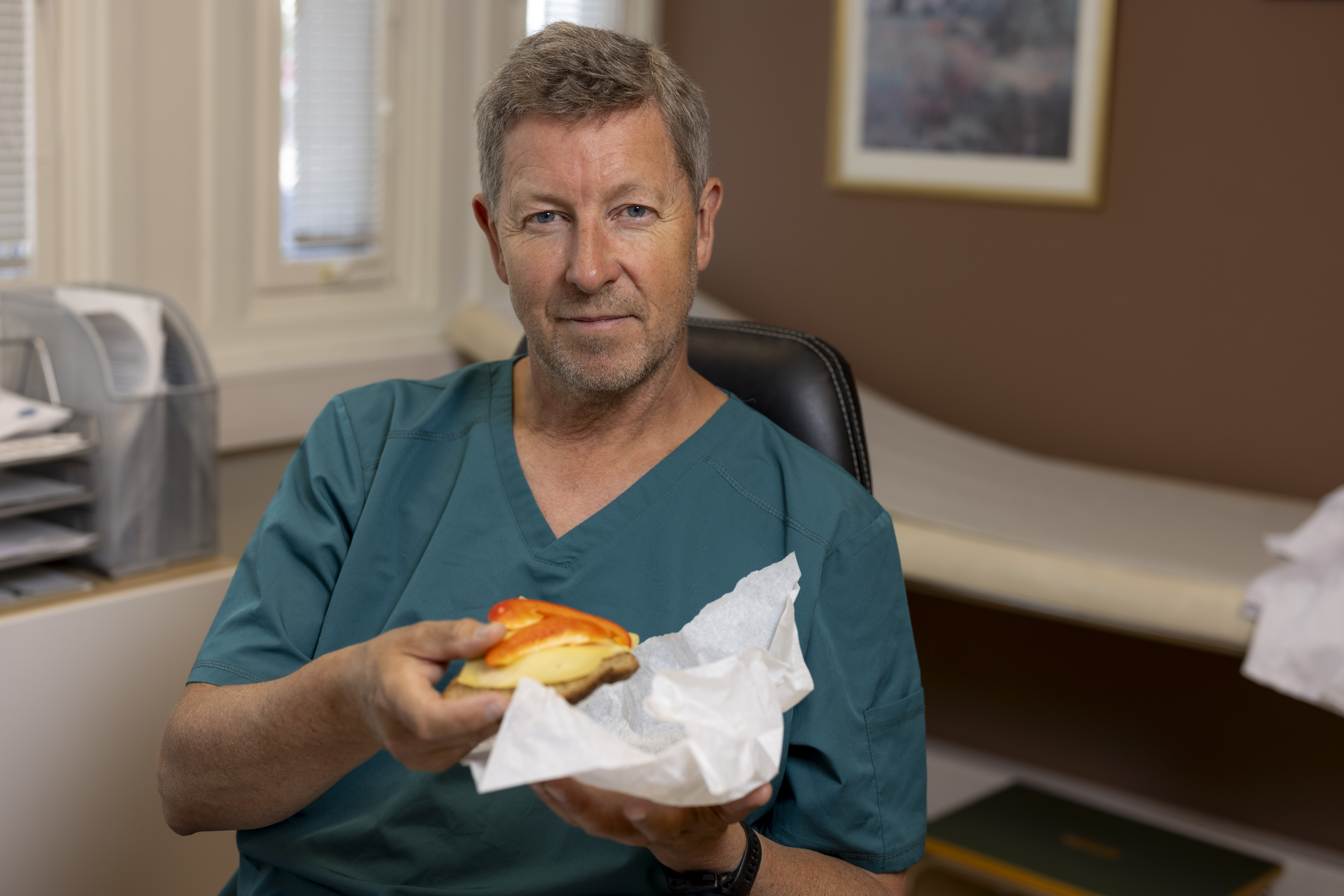 Lundberg henter fram matpakken han skal spise til lunsj, og pakker opp papiret. Den inneholder en grovbrødskive med to skiver ost med noen røde paprikabiter som pynter opp.