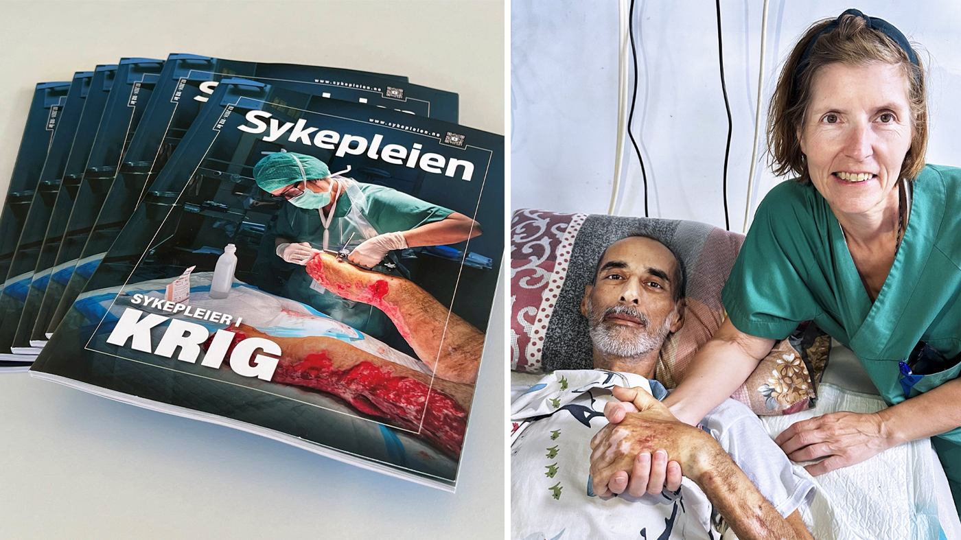 KRIG: Dette er forsiden av Sykepleiens temautgave 2/2024 om sykepleiere i krig. Operasjonssykepleier Hilde Vollan er i arbeid i Gaza.