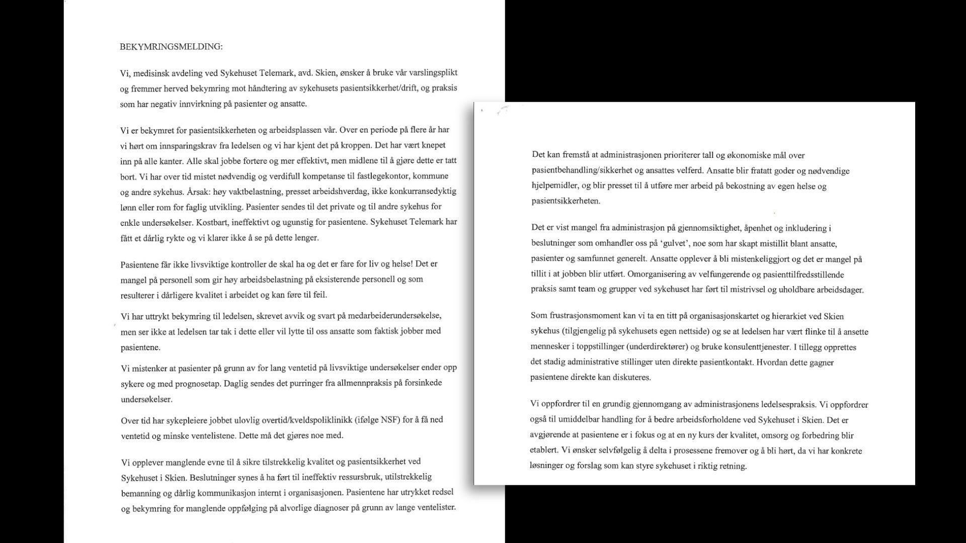 Ifølge lokalavisen Telemark Arbeiderblad [krever abonnement] handler brevet om at de ansatte ikke blir hørt av ledelsen: