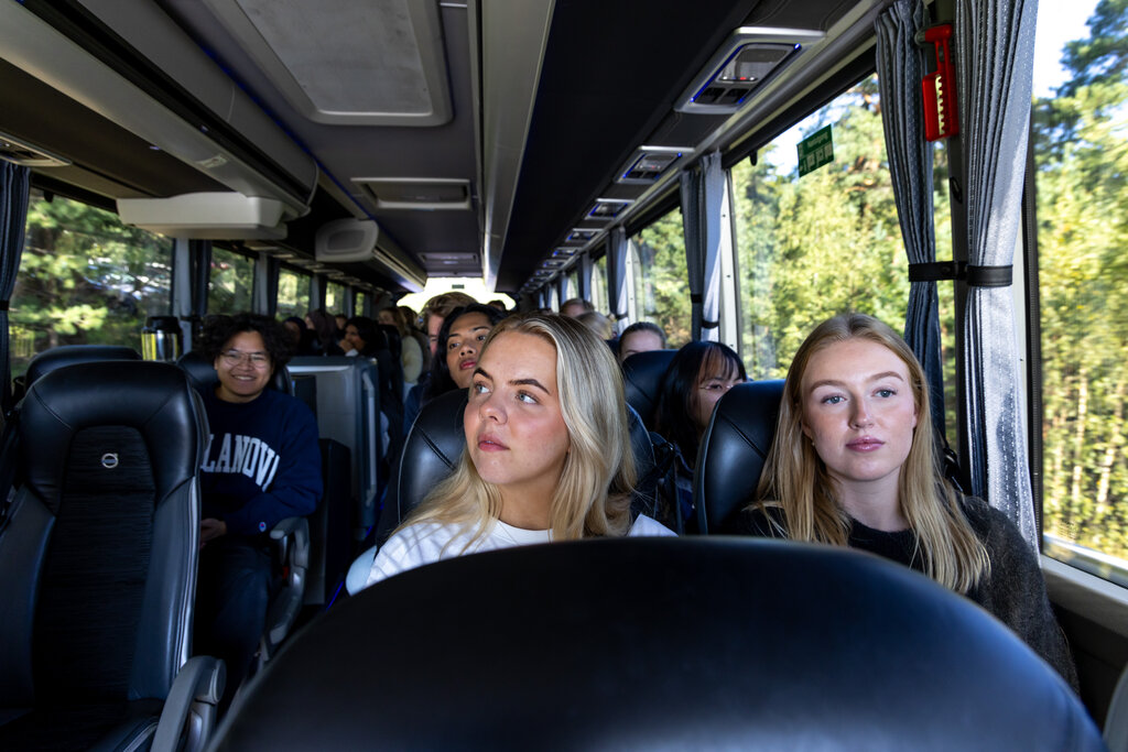 17 sykepleierstudenter blir busset rundt i bydel Søndre Nordstrand i Oslo for å se hvor de skal ha praksis i sitt siste studieår. Guide på turen er bydelsdirektøren, som tidligere har jobbet som sykepleier selv.