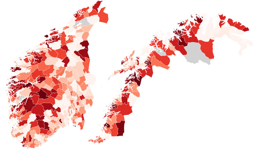 I kartet og tabellen kan du søke opp den kommunen du er interessert i eller trykke på kommunen i kartet.