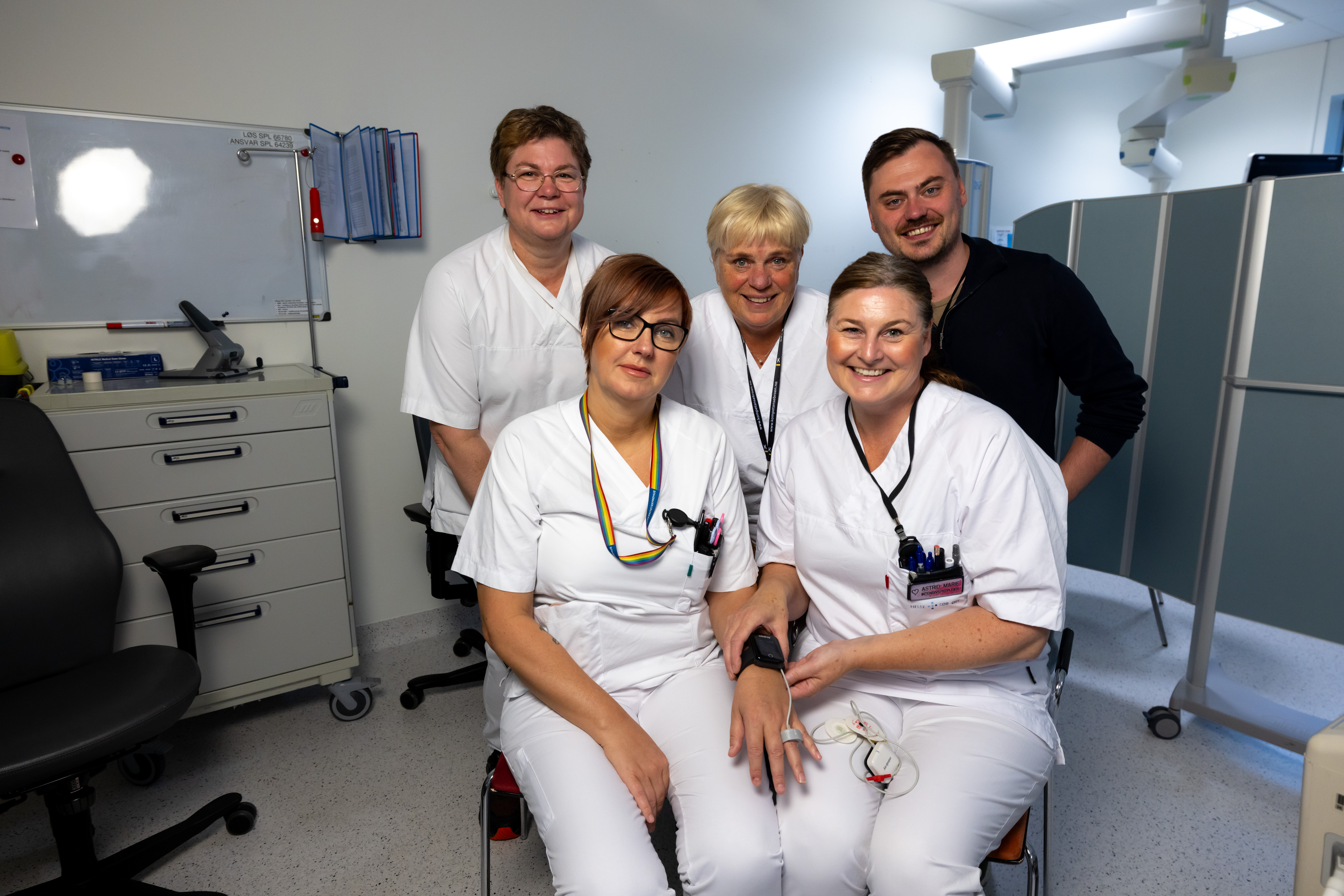 SE VIDEO: Via sensorer som er festet til pasientens finger, håndledd og overkropp, får sykepleierne informasjon om hvordan det ligger an med vitale parametere. Pilotprosjektet ved øre-nese-hals på Ahus har ført til litt senkede skuldre for sykepleierne.