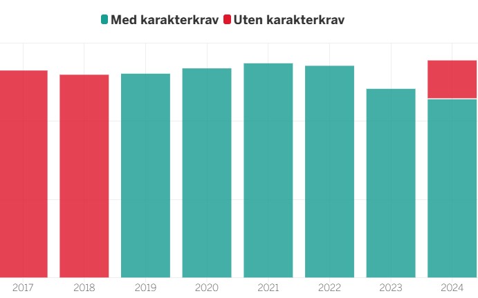 Tidligere var kravet minimum karakteren 3 i norsk og matematikk for å komme inn. Men i 2024 ble det åpnet for studieplasser som sto ledige etter det ordinære opptaket ved åtte institusjoner.
