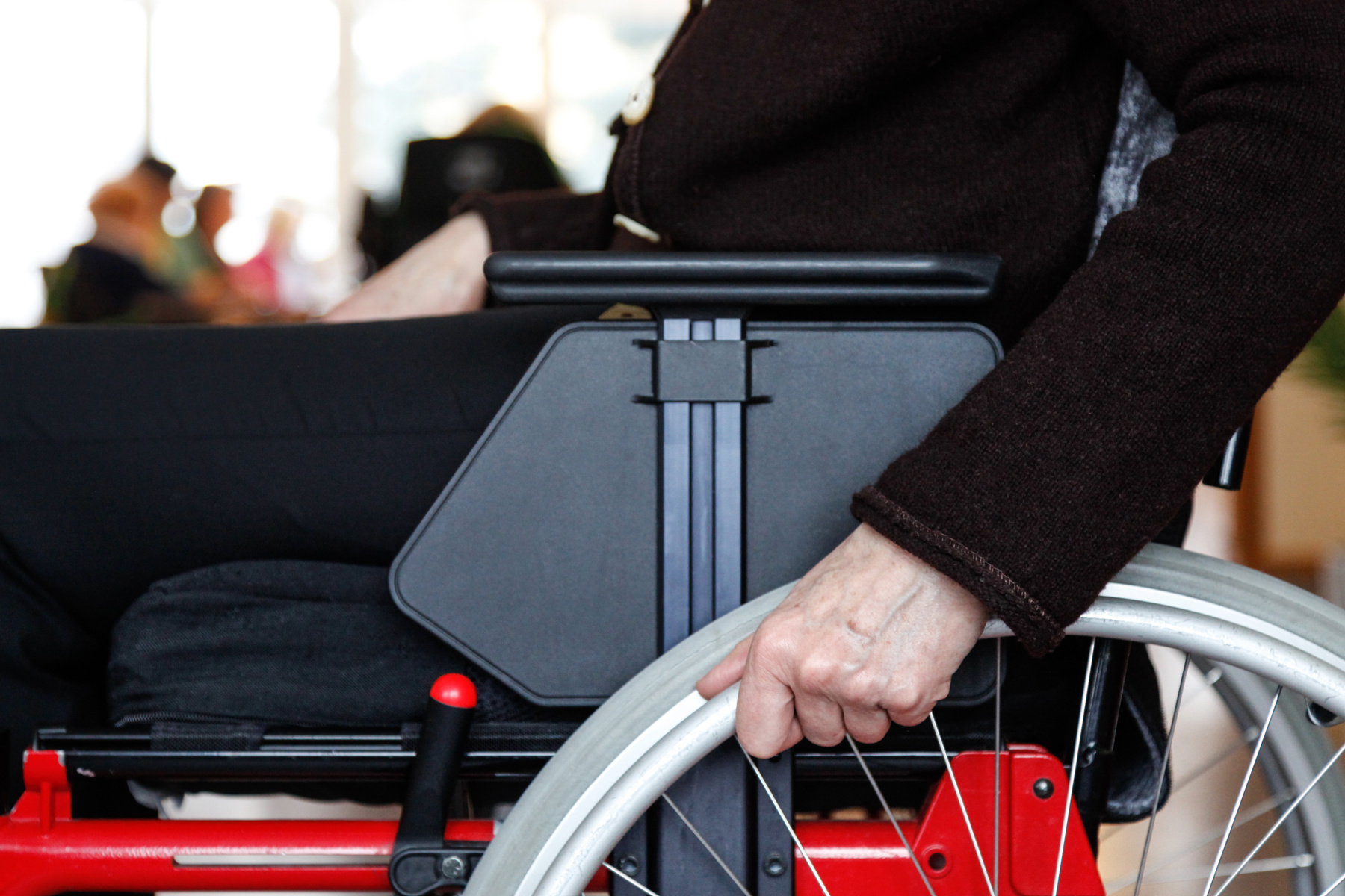 Bildet viser et utsnitt av en person som sitter i rullestol