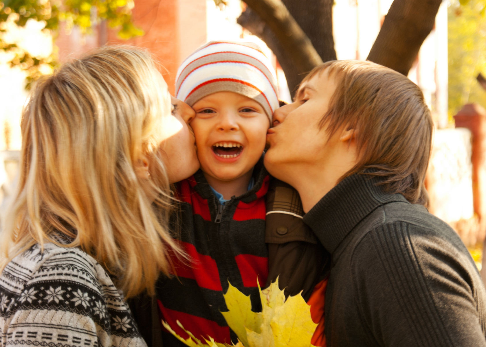 Bildet viser en mor og en far som gir sitt barn et kyss på hvert kinn.
