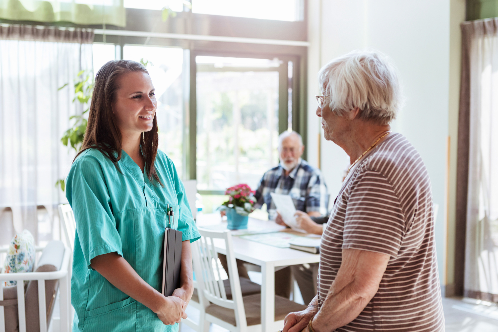 Bildet viser en sykepleier på sykehjem som snakker med en kvinnelig student