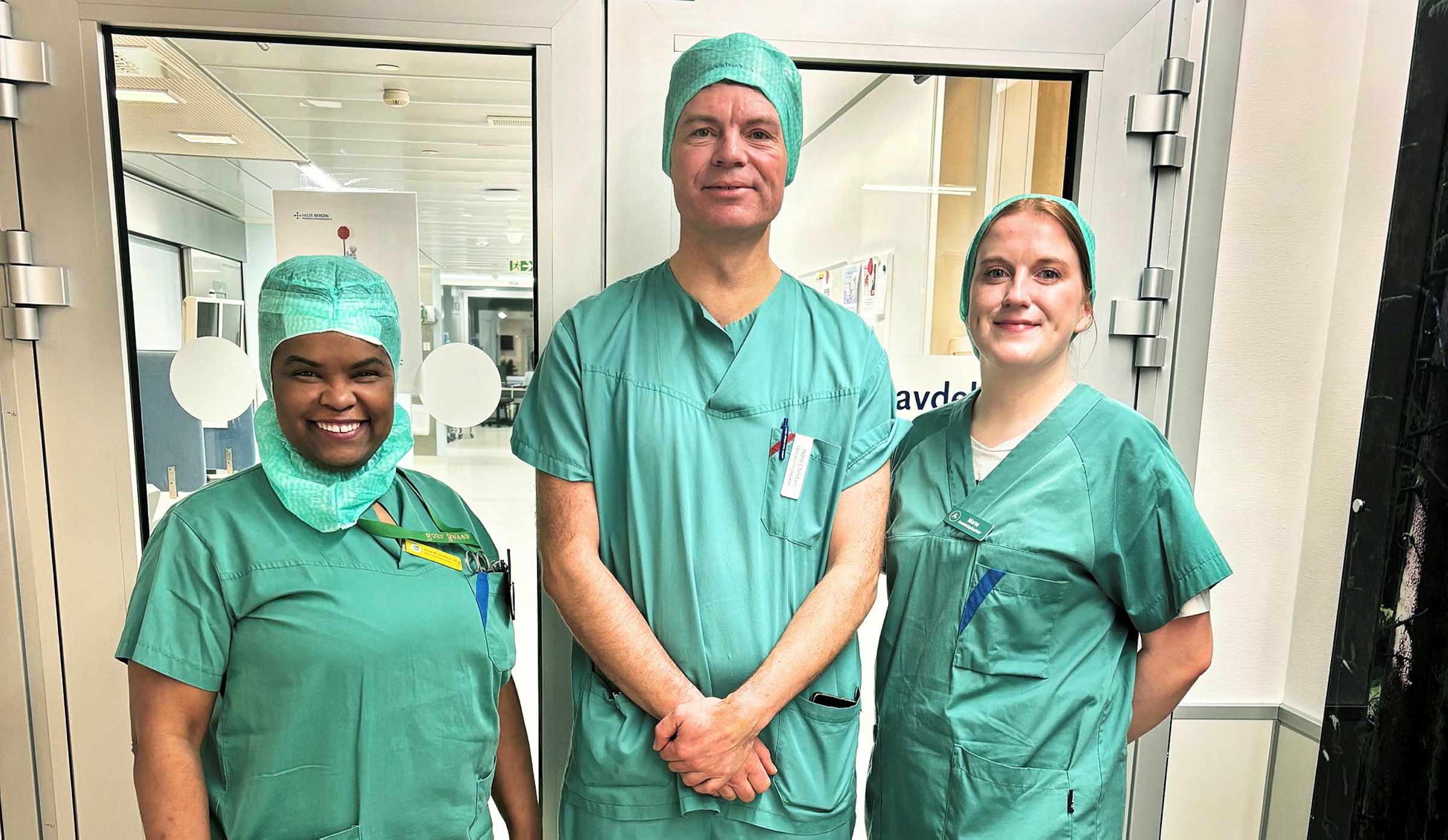 Fra venstre: Anestesisykepleier Rosa Mirian Riva Reyes og operasjonssykepleierne Hans Christian Tenol-Tuxen og Marte Bjørkelund.
