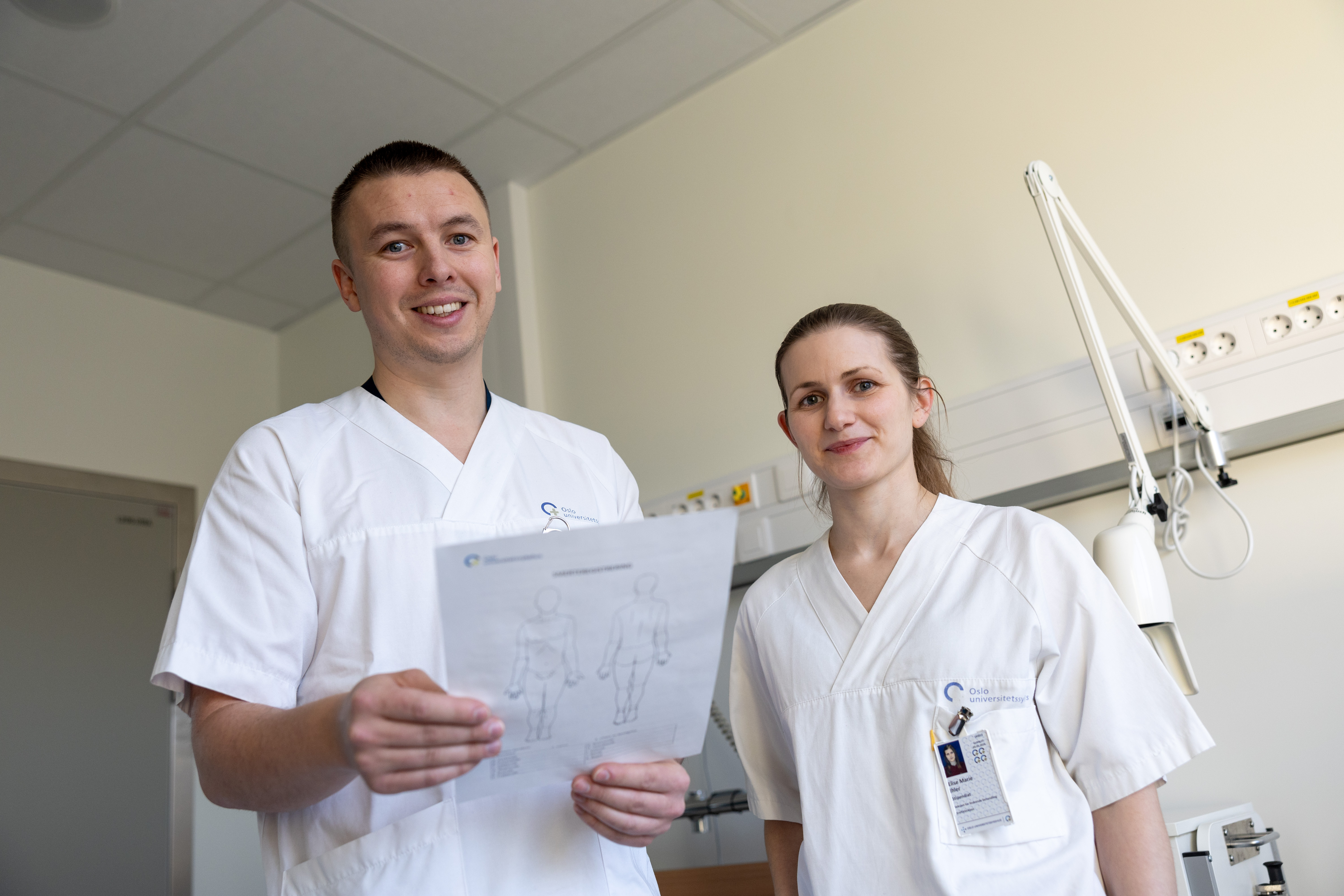 Inne på et tomt pasientrom på sengeposten på Radiumhospitalets lindrende avdeling viser kreftsykepleierne Elias David Lundereng og Elise Marie Ihler frem et A4-ark: