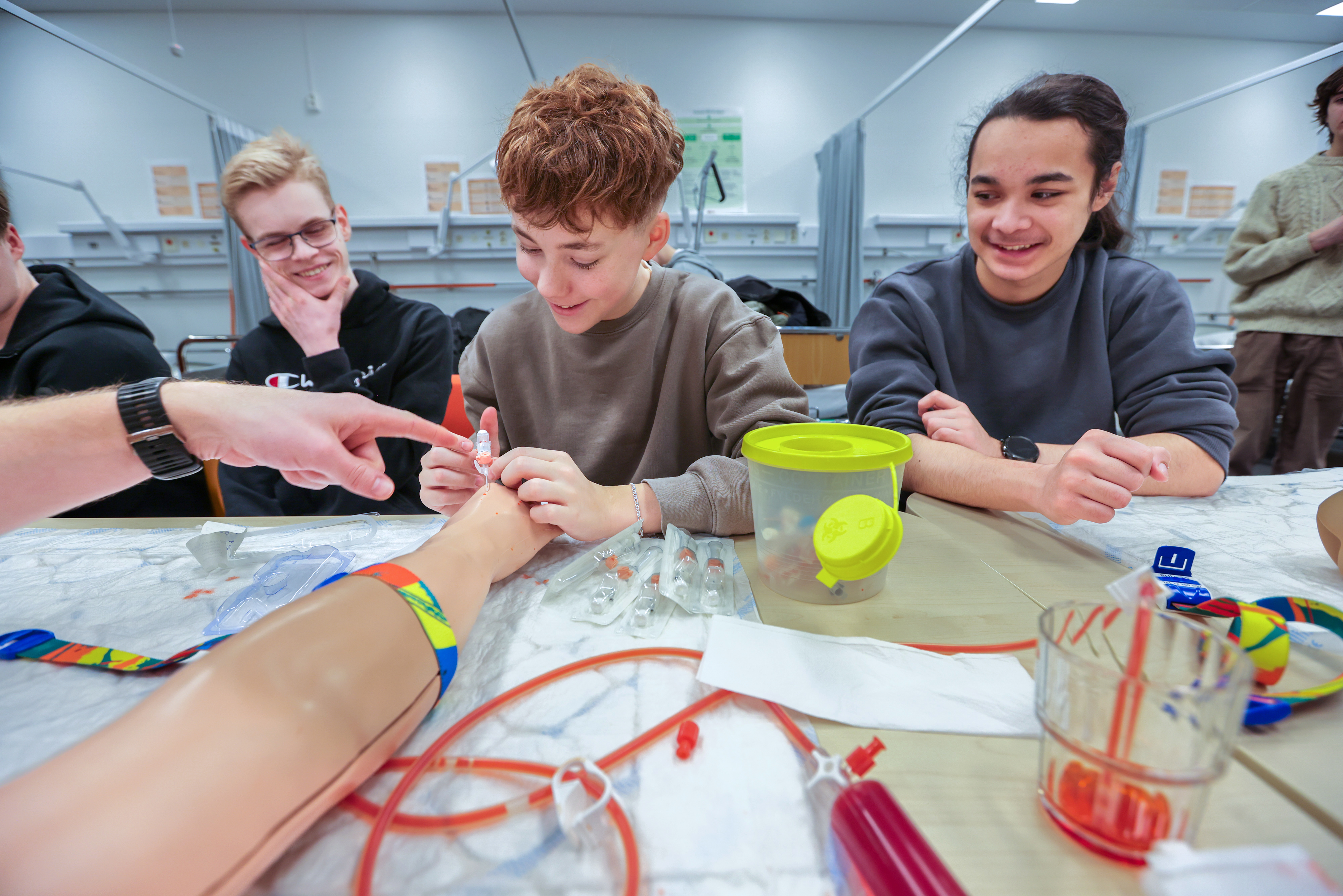 så perifert venekateter (PVK) er spesielt artig. Bak følger medelev Leander Johan Sand nøye med. Foto: Yngve Olsen