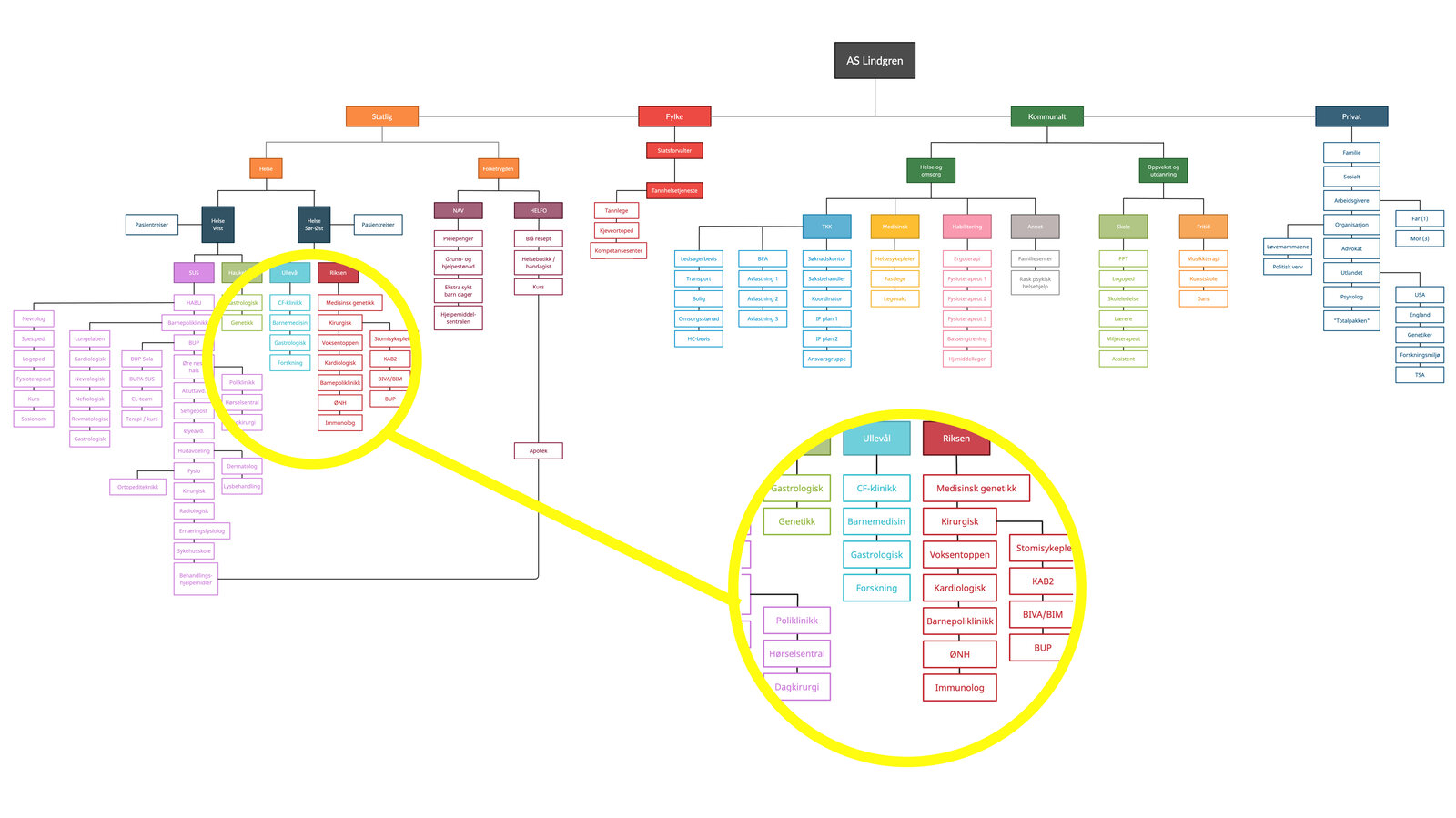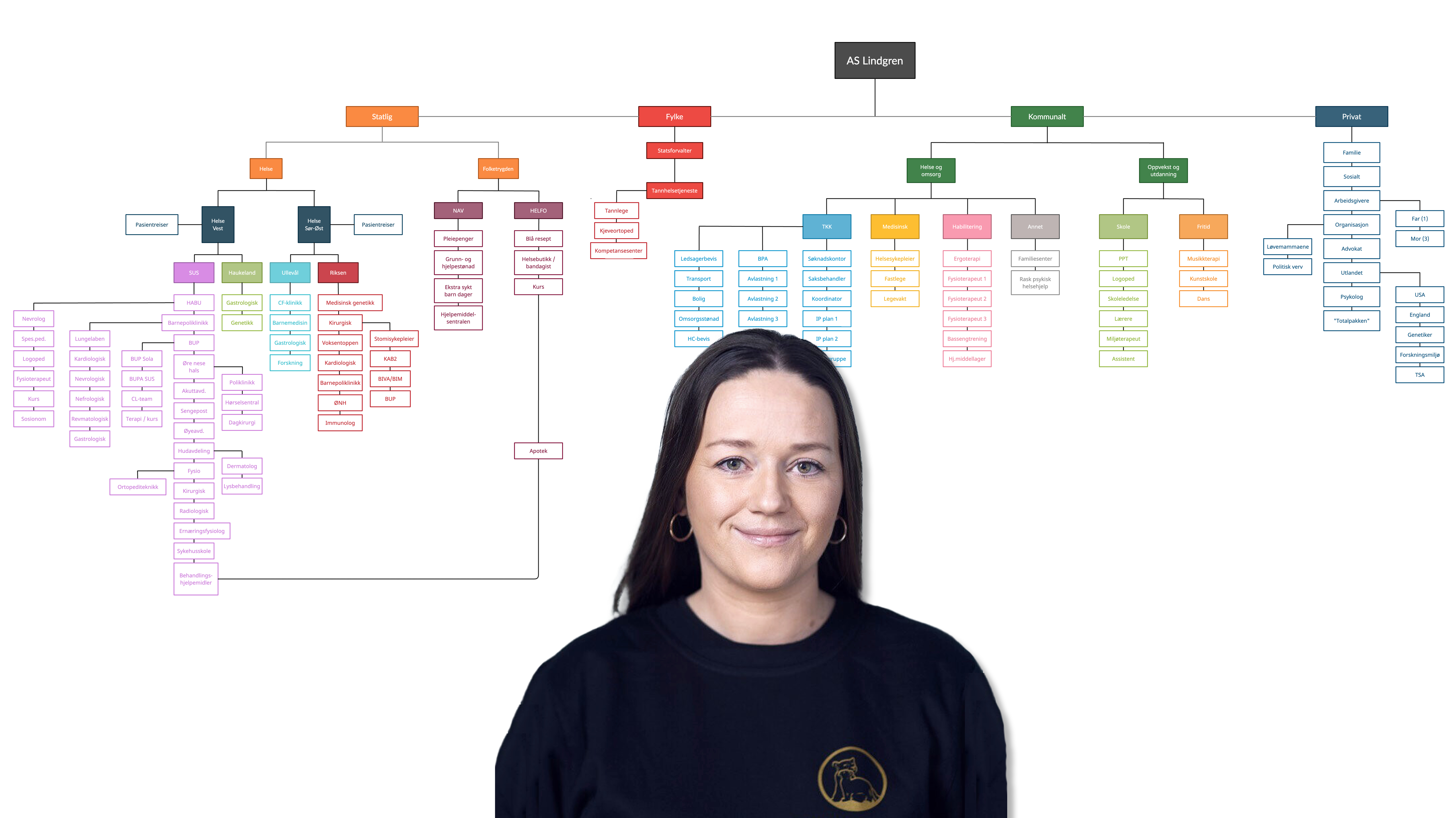 Her ser man hvilke institusjoner, etater, avdelinger og tjenester familien opp gjennom årene har måttet forholde seg til for å få den hjelpen de trenger og har krav på.
