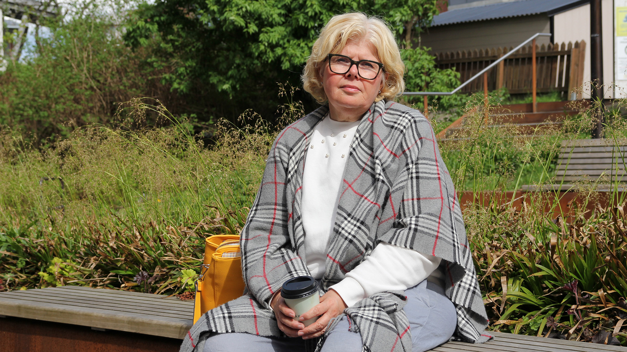 Bildet viser kreftoverleveren Ingunn Haugenes på en benk