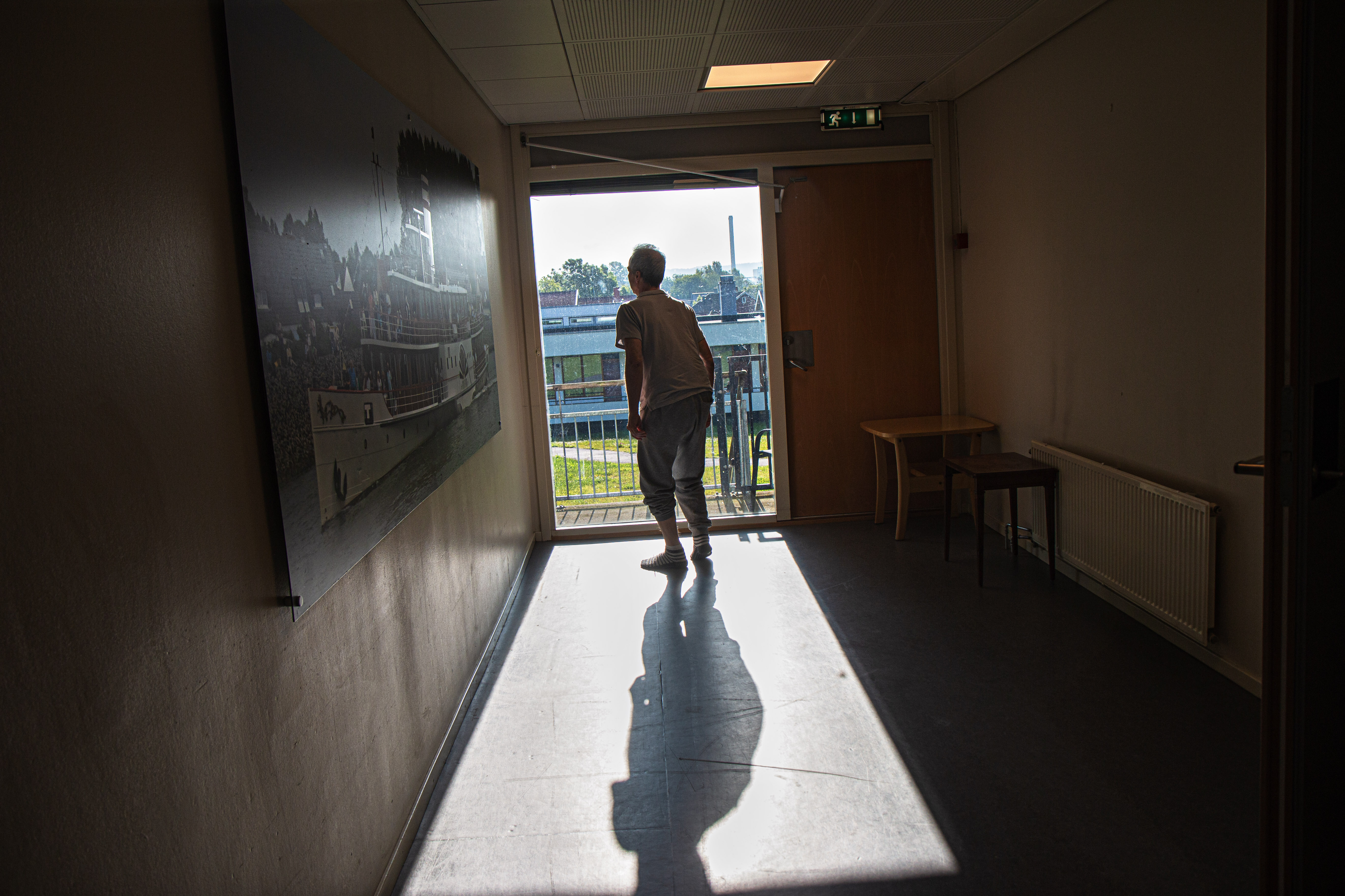 Dagslyset siver ned fra vinduene høyt oppe under taket og fra vinduet ut mot hagen. Når det er pasienter i fellesmiljøet, skal det alltid være minst en ansatt til stede.