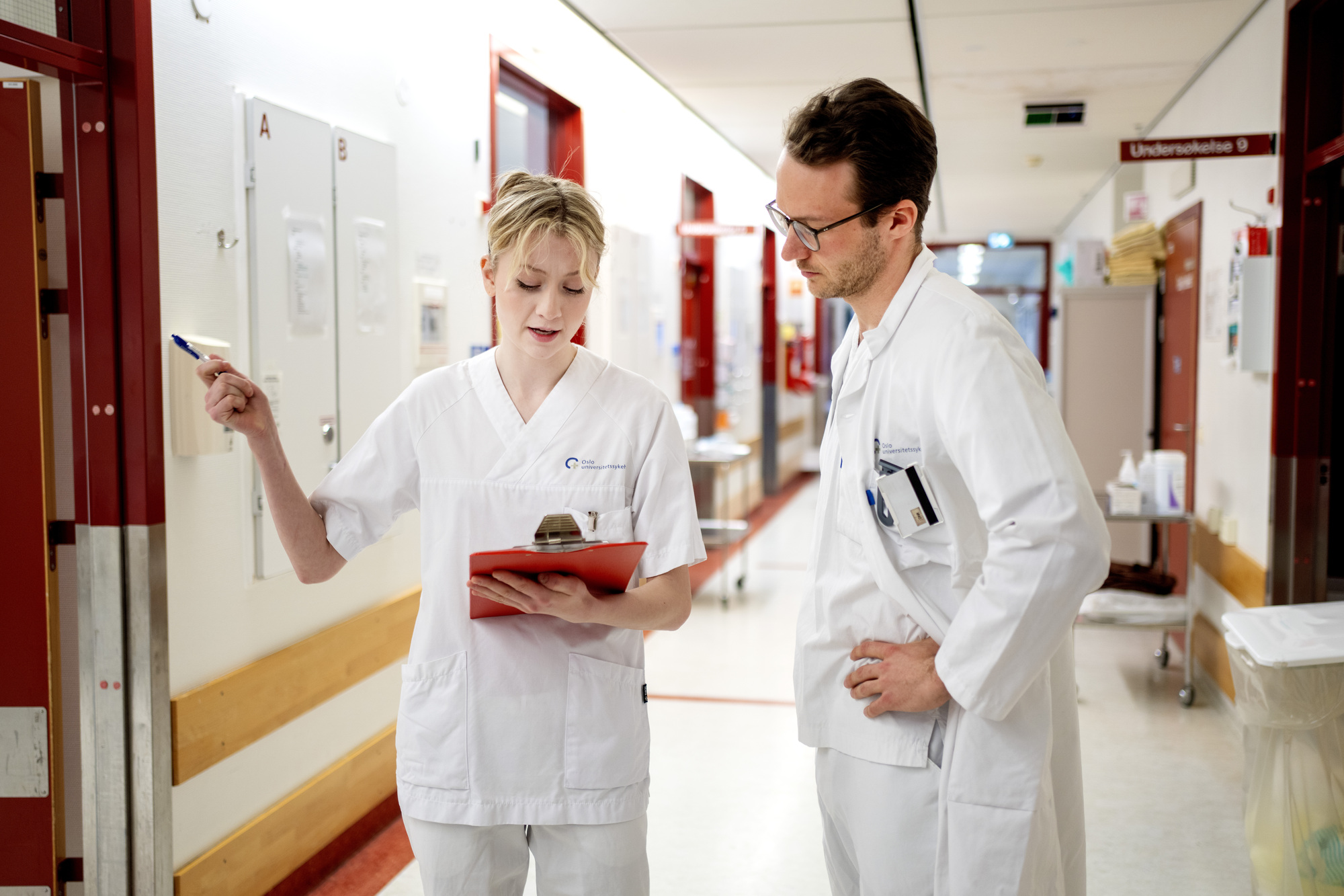 Bildet viser en sykepleier som diskuterer med en lege.