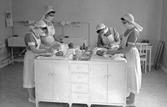 Etter fødselen tok elevene seg av barna, som lå alene på barnerommet og ble matet med flaske.