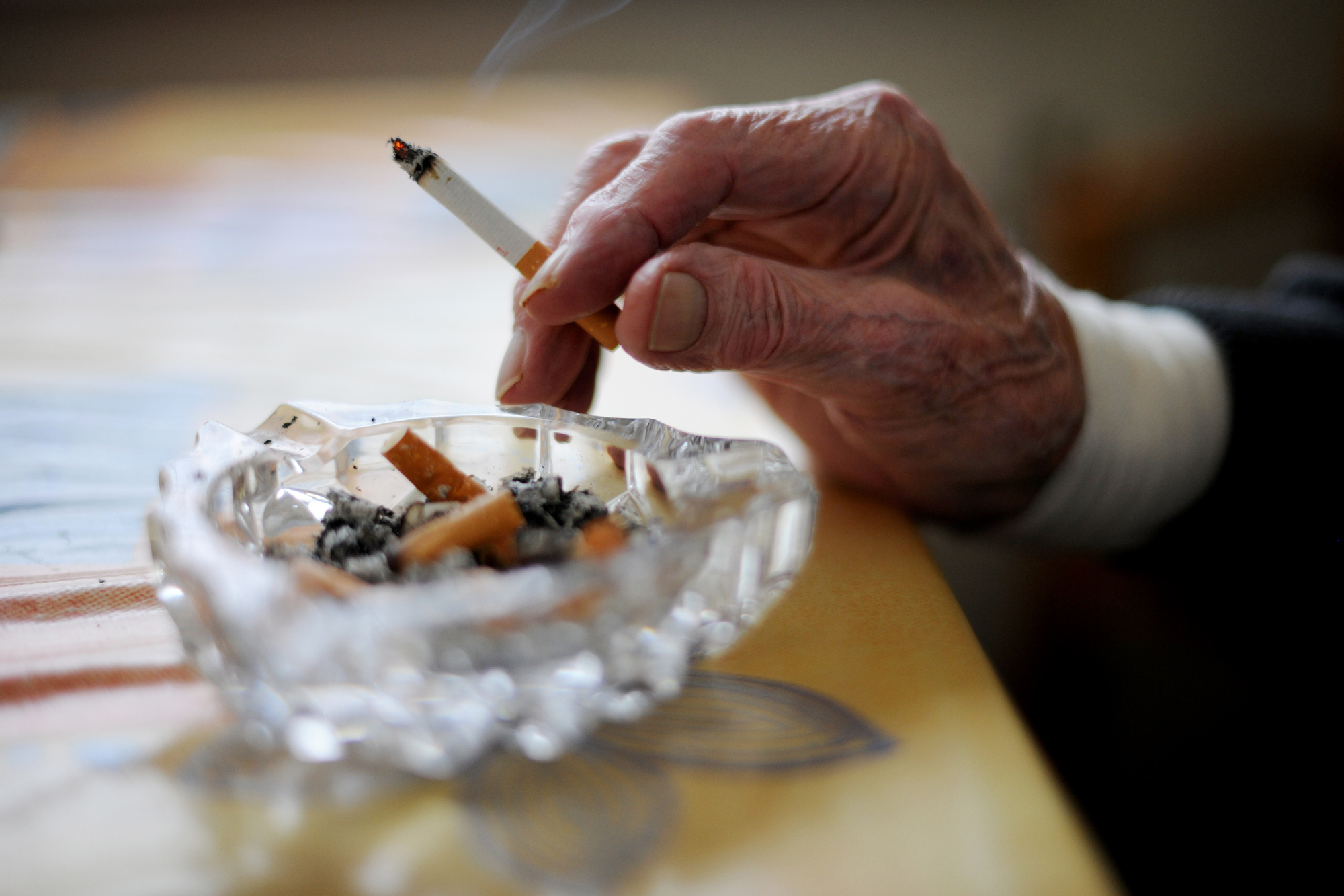 Bilde av hånd med sigarett over askebeger