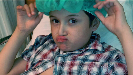 Oscar som ble behandlet hjemme i sykesengen og nær bilder av magen med teknisk utstyr.