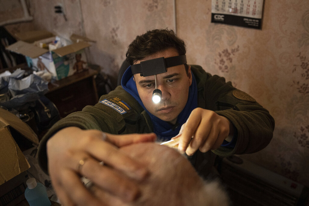 MEDISINSK HJELP: Sykepleier Joseph Farkas (61) undersøker en pasient i byen Khrestysjtsje i Donetsk-regionen i Ukraina. Datoen er 19. mars i år.