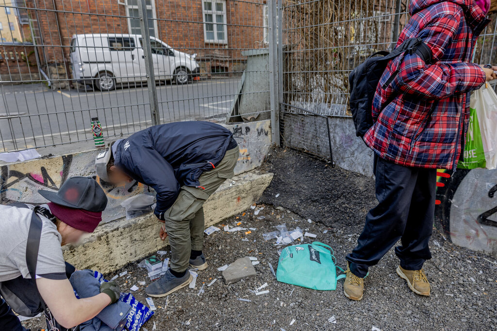 ROTE OG RYDDE: Brukte sprøyter, plast­avfall og annet brukt utstyr hoper seg opp utenfor et parkeringshus i sentrum. Noen roter, andre rydder, også i rusmiljøet. – Enkelte rydder også opp etter andre, fordi de liker så dårlig at sprøytespisser og liknende blir liggende og flyte, sier sykepleier Kristian Neegaard.