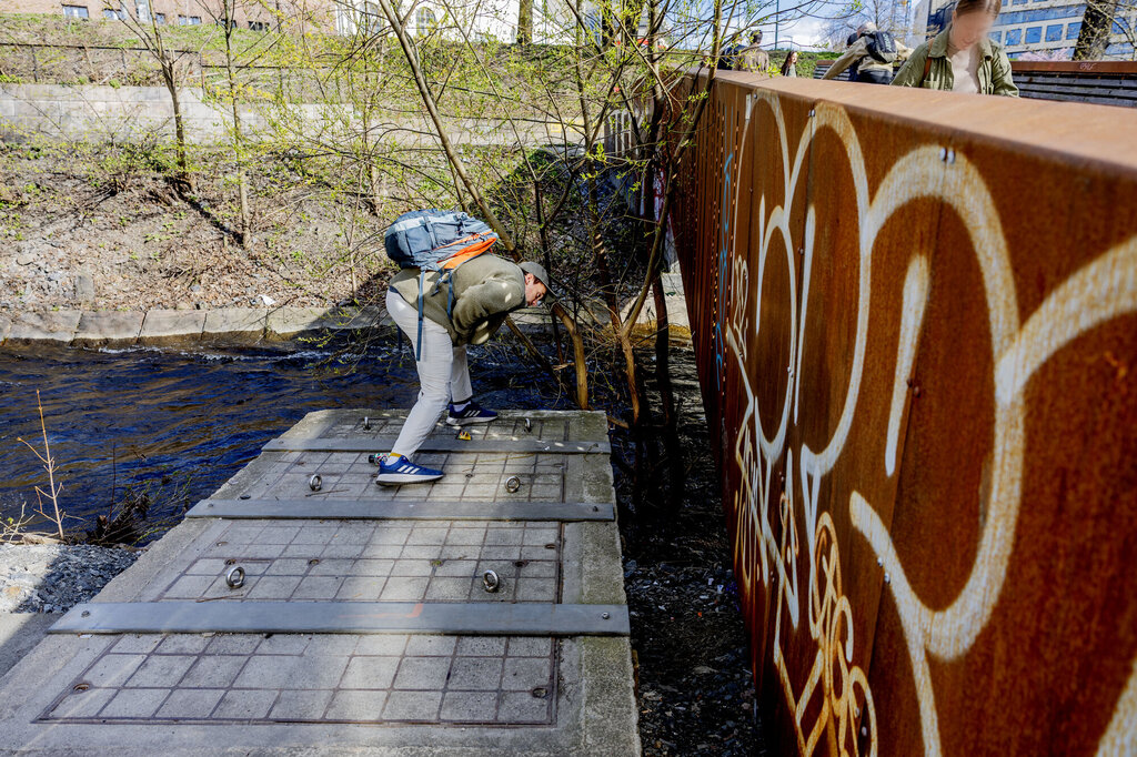 En kjapp sjekk under en av byens mange bruer på veien. Skrekken er at noen har satt en overdose akkurat her, slik at de må starte livreddende behandling i den bratte, grusete skråningen ned mot Akerselva.