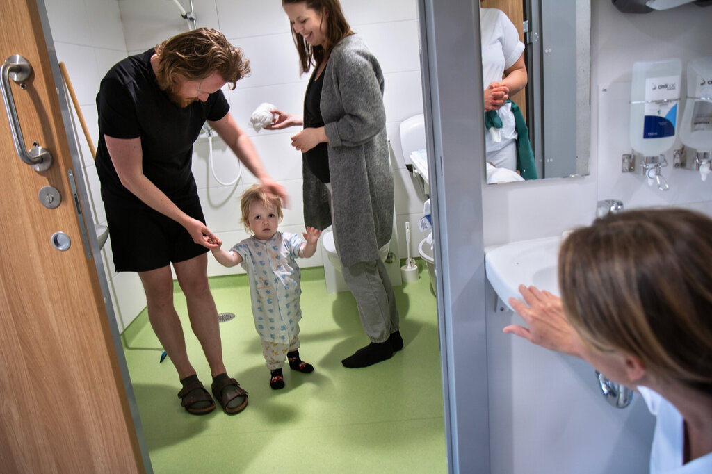 Nå triller sykepleierne ham samme vei som de kom. Mor og far følger med.