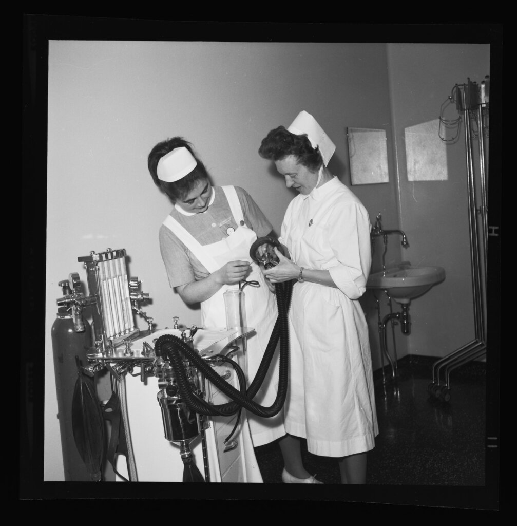 Diakonisser klargjør anestesiapparatet. Bildet er fra 1968.