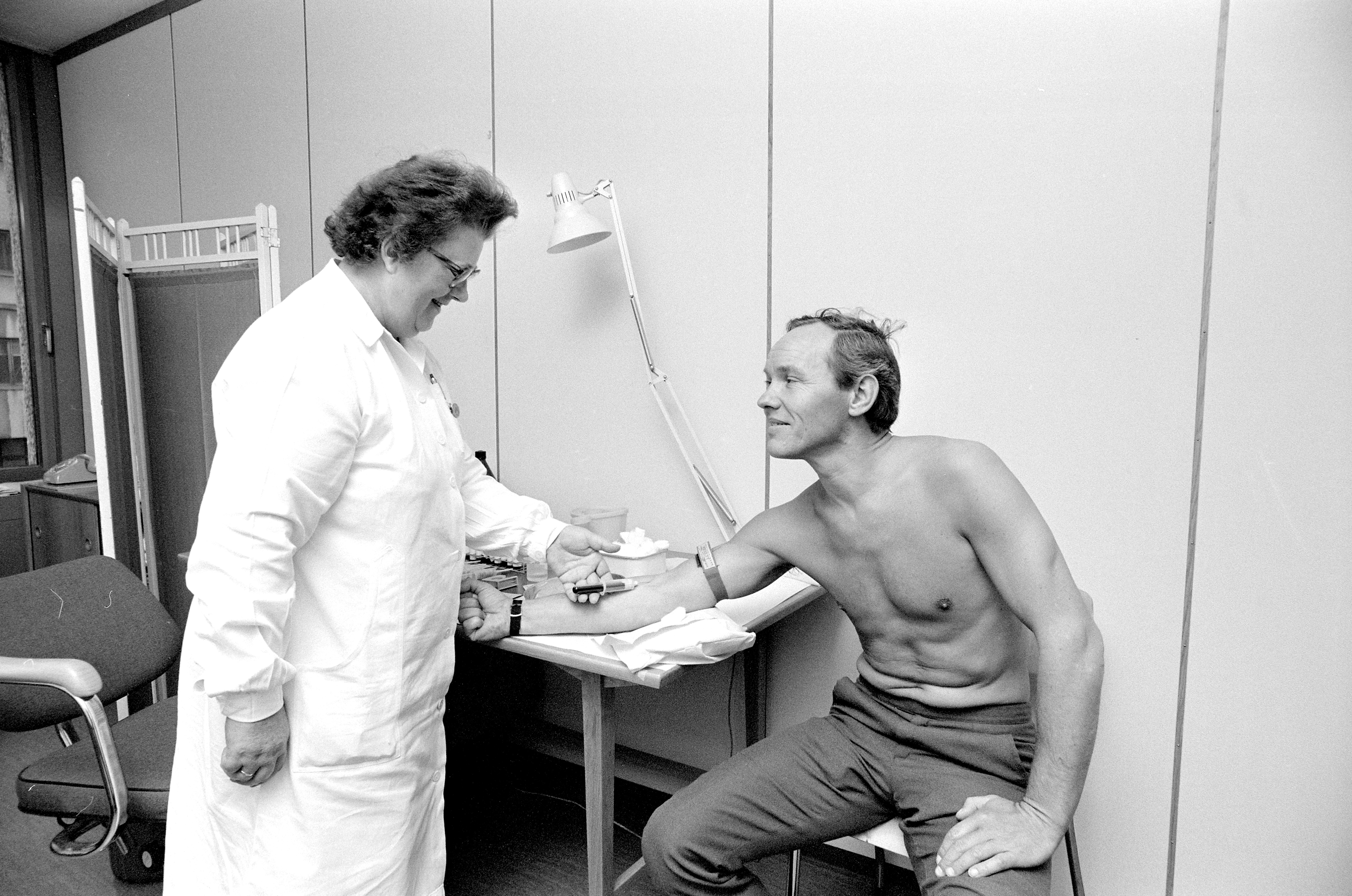 Hvordan er det med hjertet? Den store Oslo-undersøkelsen som tok sikte på å kartlegge og forebygge risikoen for hjerteinfarkt blant menn i alderen 40-49 år. Til sammen ble cirka 30 000 menn innkalt. Undersøkelsen var den første i sitt slag i verden ut fra omfanget av opplegg, størrelse og målsetting. Ved Oslo helseråd foretok de også veiing og måling. Sykepleier Ester Andersen tar her blodprøve av Roger Vilbo.