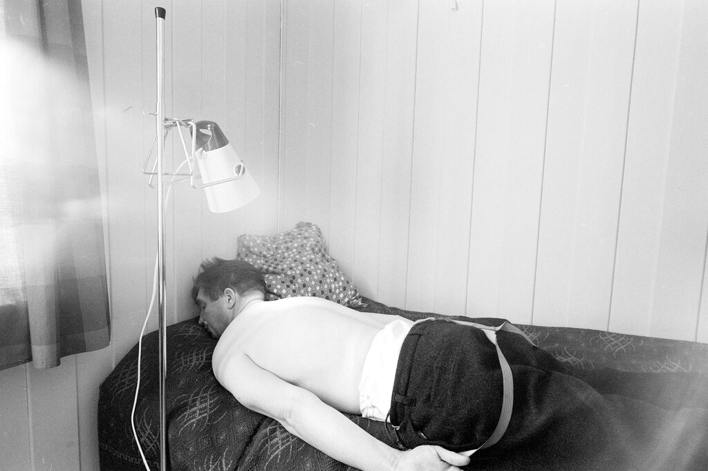 En gang hadde Norsk Revmatikerforbund hadde behandlingsbusser plassert rundt om i landet. En av dem på Skarnes i Odalen, og den kjørte ut fra Sør-Odal Revmatikersykehus kl. 8 om morgenen. To fysioterapeuter behandlet den første pasienten en halv time senere. Hans Vik ligger klar for behandling. Bildet er tatt i 1969.