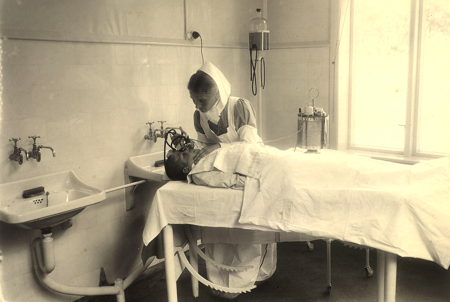 En sykepleier behandler en ung pasient på Kysthospitalet i Hagavik. Bildet er tatt mellom 1920 og 1930.