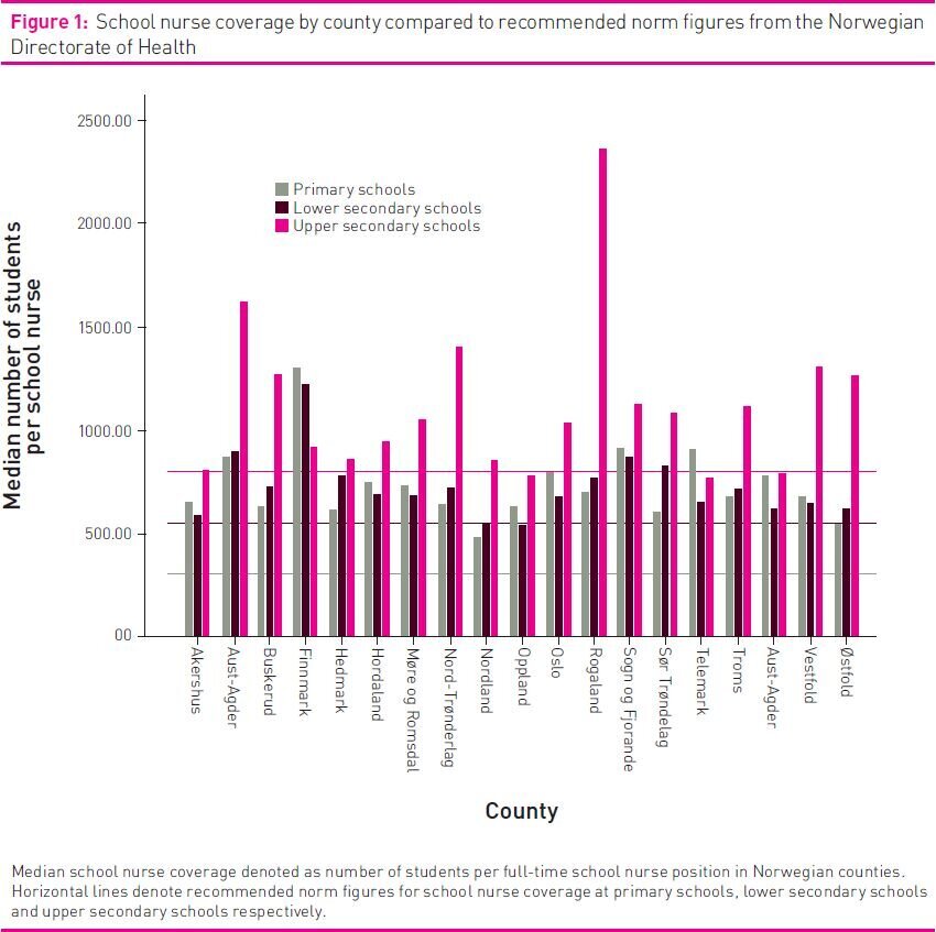 In its development strategy for child health clinics and school health services, the Norwegian Directory of Health has worked out a proposal for a staffing norm (1). The proposed minimum norm for school nurse coverage in relation to students is based on a calculation of the time needed to perform professionally recommended tasks in the school health services. The recommended norm per full-time school nurse position is 300 students in primary schools, 550 in lower secondary schools and 800 in upper secondary schools.