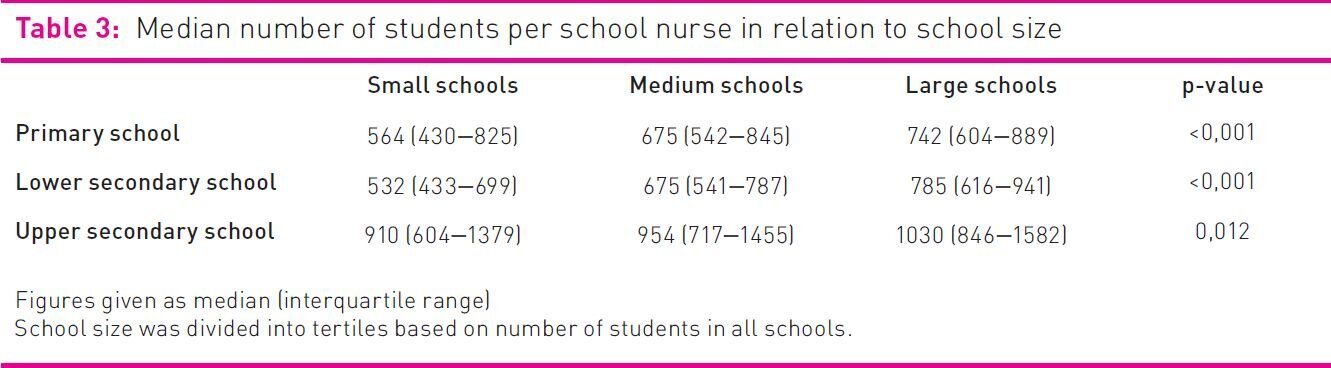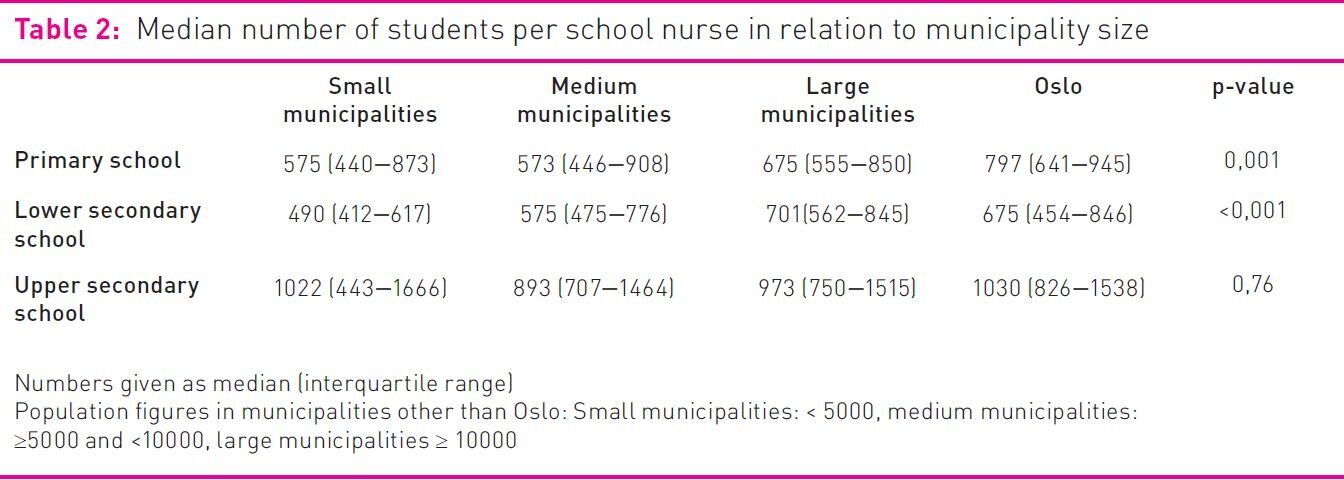 Median coverage rate varied according to municipality size. The number of children per school nurse position increased with the increase in municipality size at the primary and lower secondary school level. In the upper secondary schools there was no relation between degree of coverage and municipality size (see table 2).