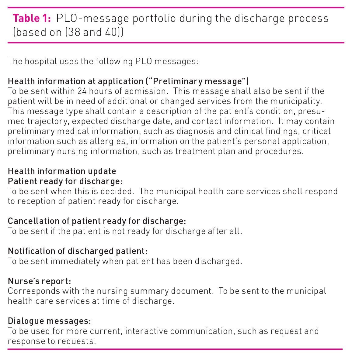 The purpose of this study is to explore nurses’ experiences with PLO-messaging in the discharge of patients from hospital to municipal health care services. The study has at its point of departure the concept of informational continuity as defined by Haggerty et al. and Reid et al. (27-28): Informational continuity is here related to the transfer of “relevant and sufficient information” between health workers in a chain. This encompasses personal information on the patient, health condition and prior treatment, so that further services can be given in accordance with the patient’s need for assistance at the right time.