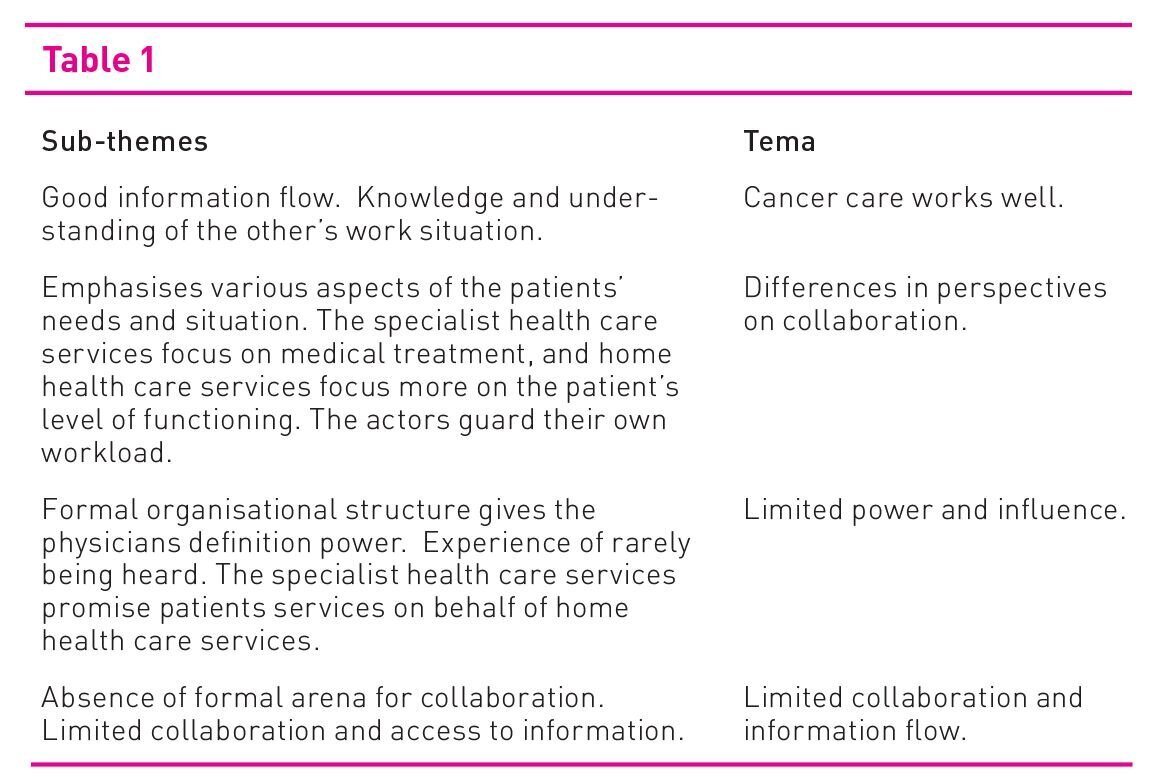 After developing the themes we analysed the interviews one more time to ensure the validity of the study (23). The analysis of the interviews showed that the nurses’ experiences with collaborating with actors in the specialist health care services were more or less identical. Consequently, we do not distinguish between informants with administrative and clinical responsibilities in the presentation of the data and in the discussion.