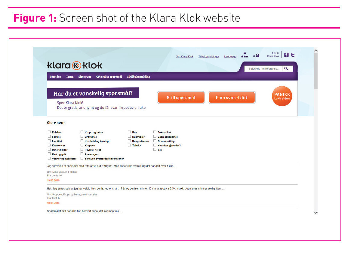 The web site Klara Klok [Klara the Wise] has as its main target group children and young people aged 10 to 25 (19). The purpose of the Klara Klok service is to offer information and counselling on a.o. body, health, and sexuality (19,20). Klara Klok is a national and open question and answer service used by young people nationwide, and has a broadly composed professional panel (19). In 2014 the website received 56 198 inquiries (19), and according to unpublished statistics from Klara Klok, 2898 of these inquiries were about contraception. The questions were as a rule answered within three to four workdays, and users have reported trusting the answers given (20).