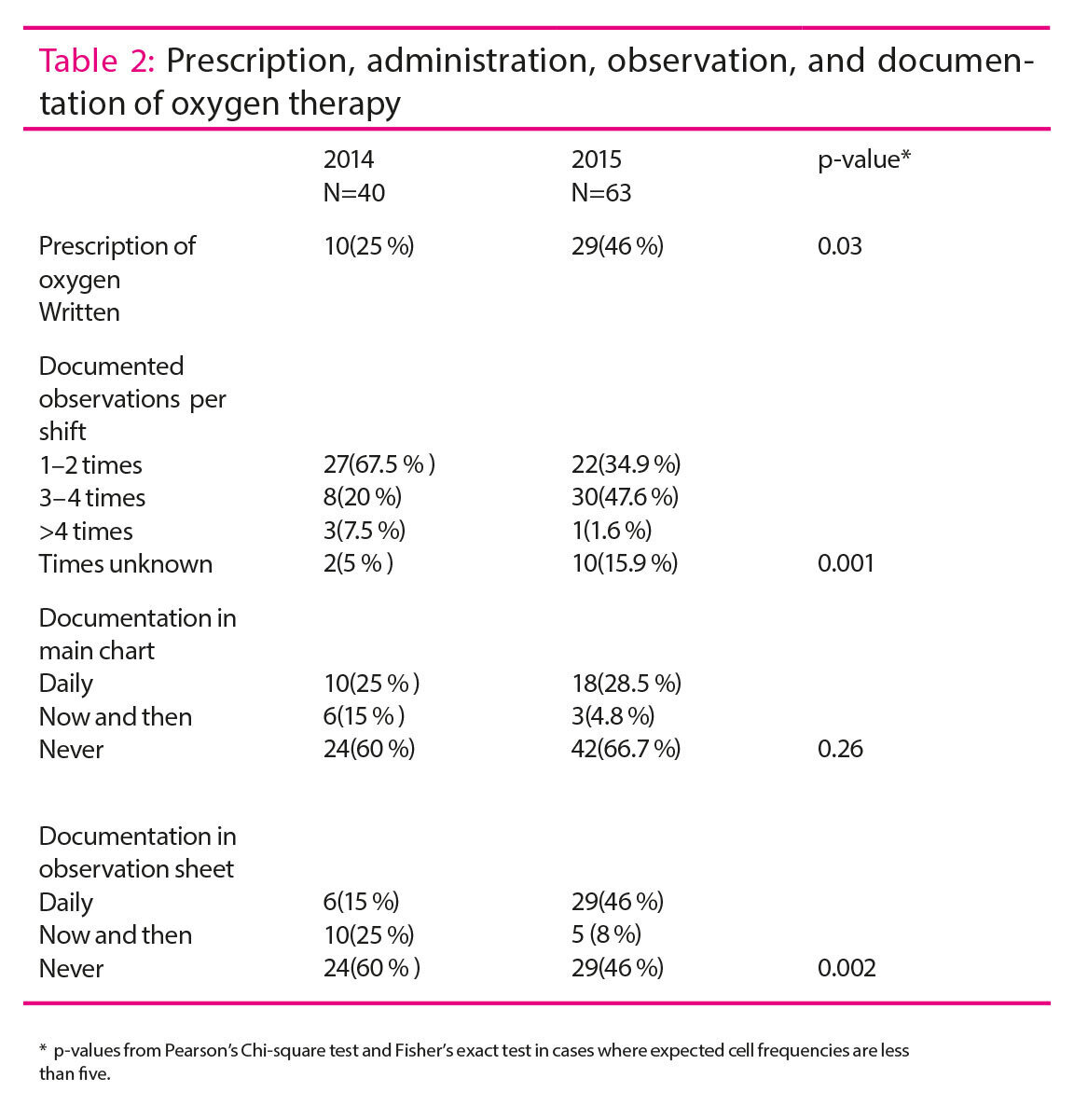Observations were documented in main chart, observation sheets, or in written report. In the first data collection ten (25 per cent) journals had daily documentation of administration method for oxygen therapy in the chart, such as two litres by nose catheter. In 24 (60 per cent) journals documentation in the chart was missing. In some patient charts the SpO2 values were documented, but not that oxygen had been administered. In the second data collection there was a small improvement, 18 (28.5 per cent) patient records showed daily documentation in the charts (table 2).